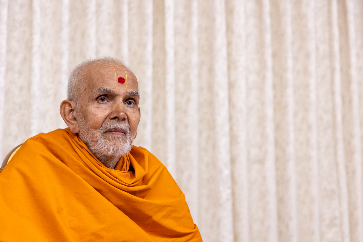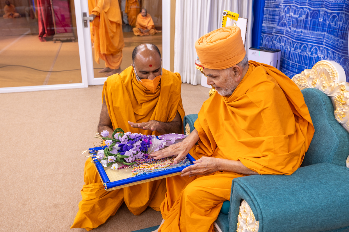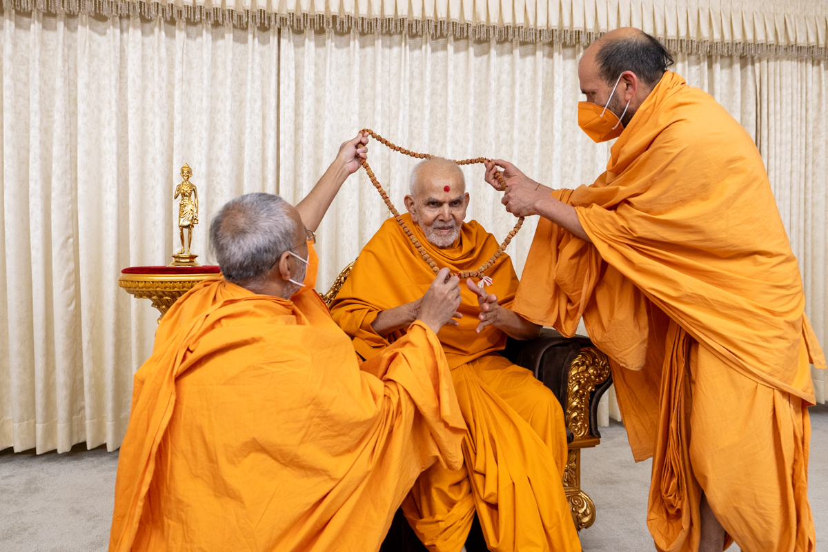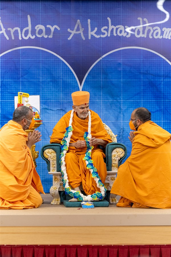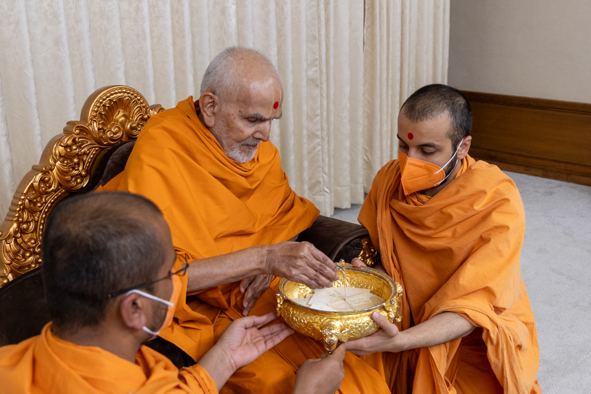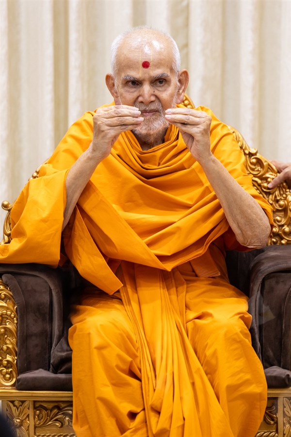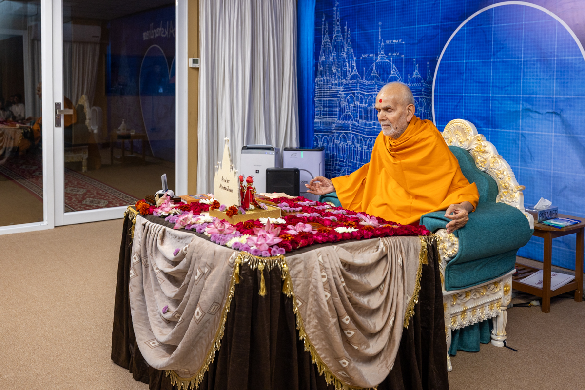 Param Pujya Mahant Swami Maharaj arrives to perform his daily puja