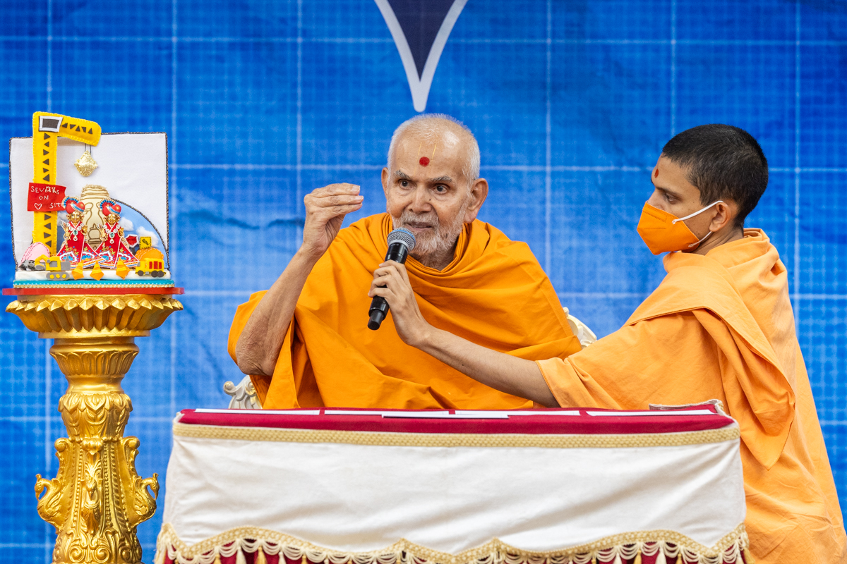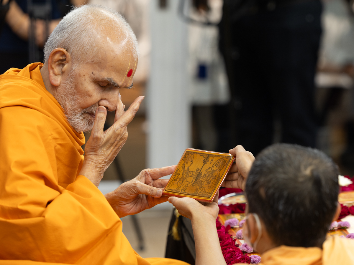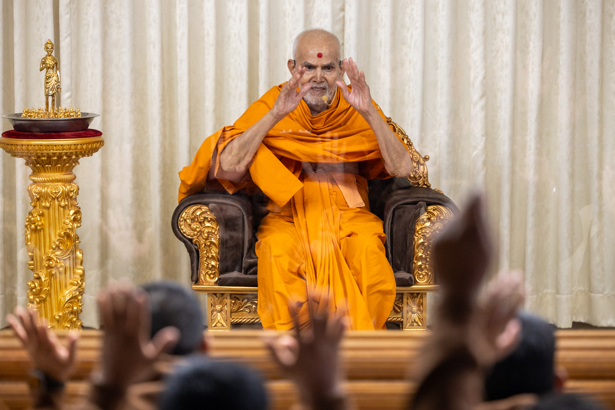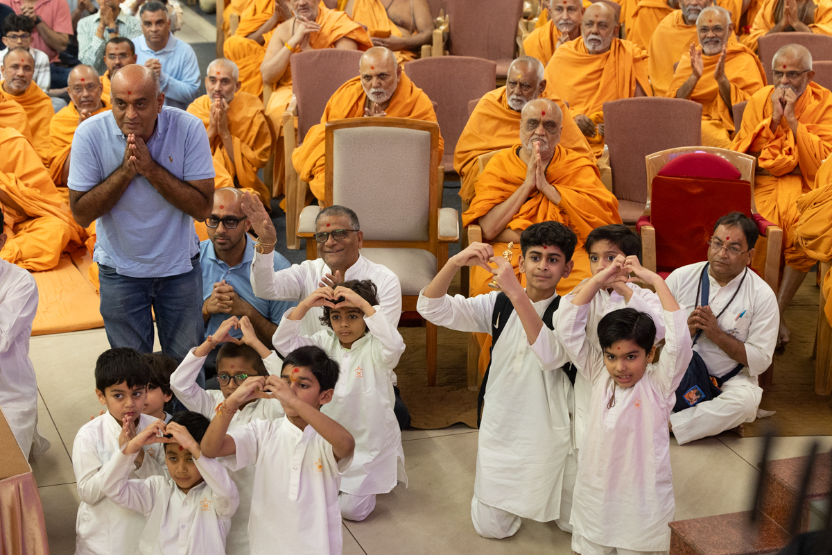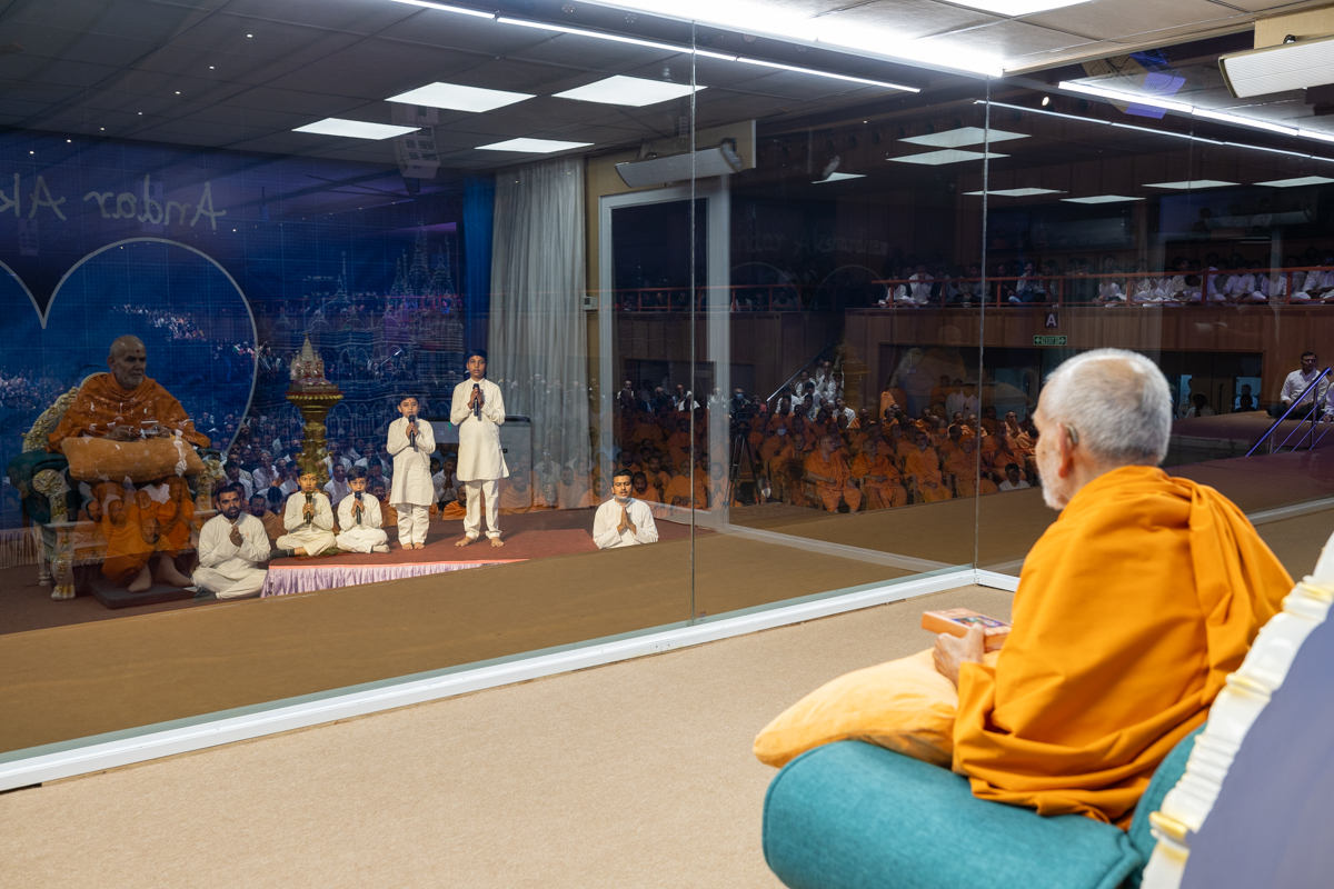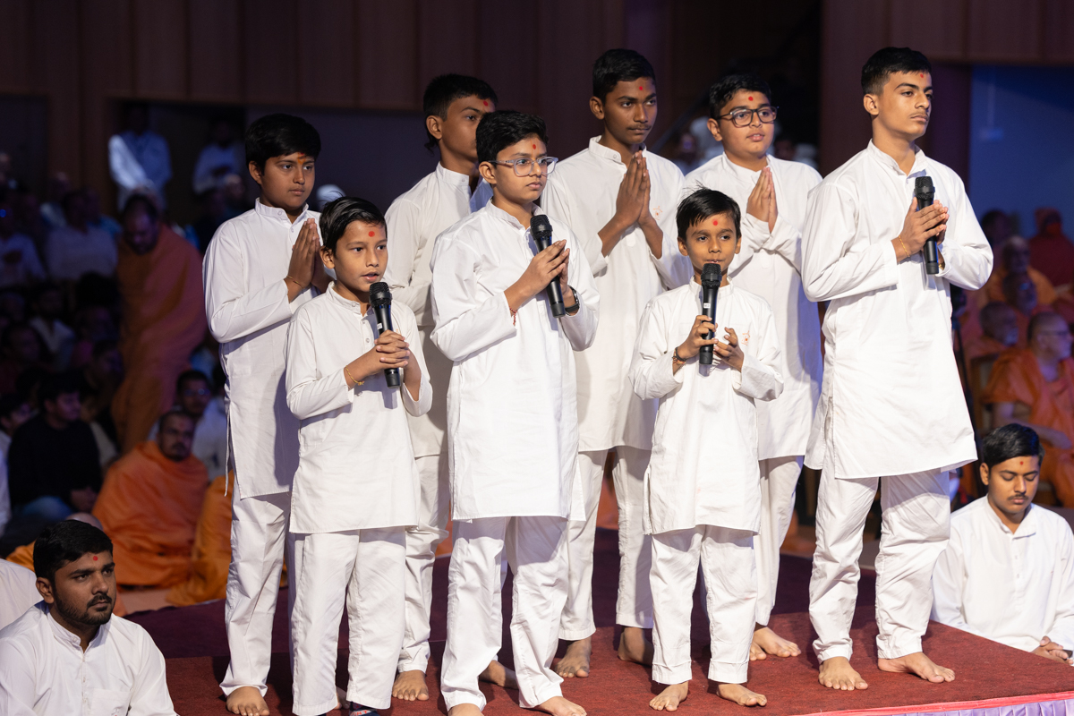 Balaks lead everyone in reciting the sadhana mantra and daily prayer in Swamishri's puja