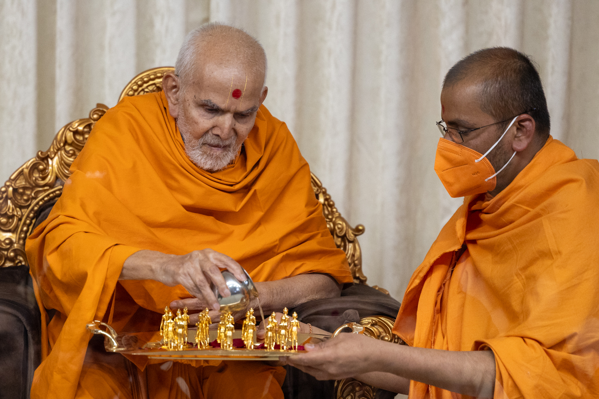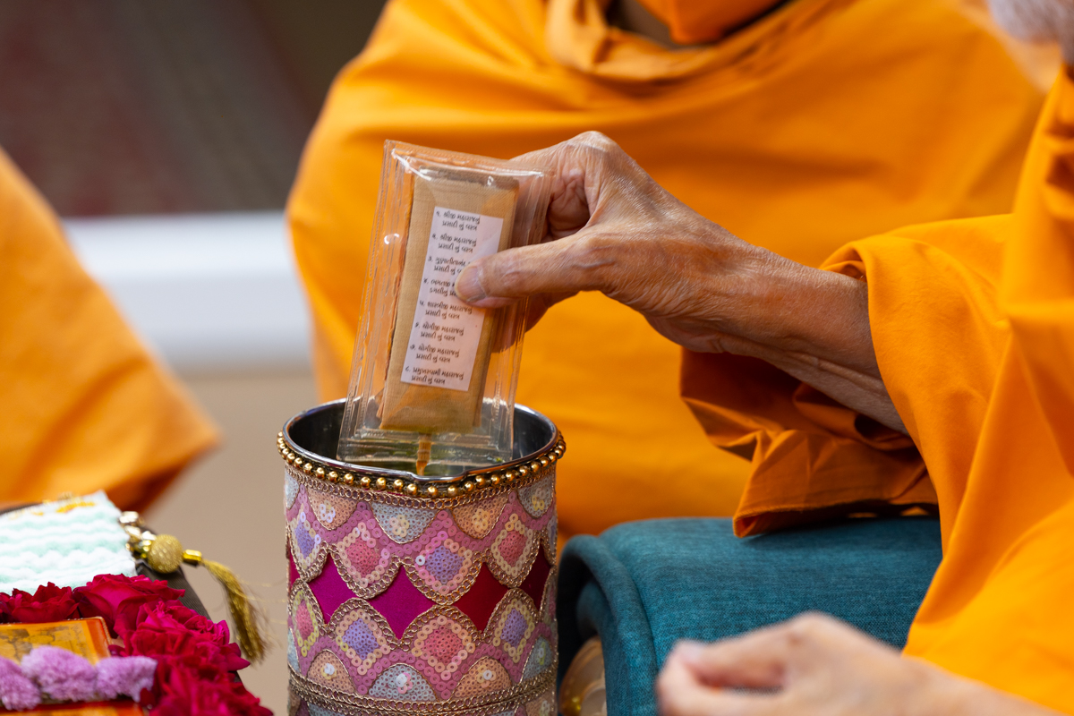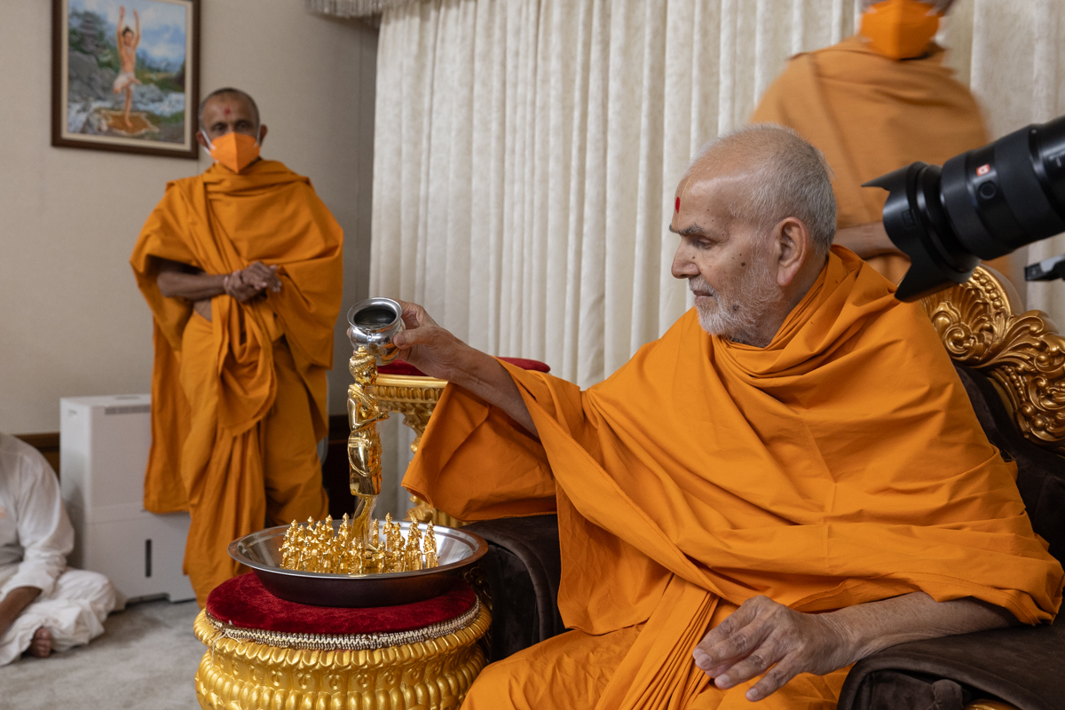 Swamishri sanctifies water with the holy relics of Bhagwan Swaminarayan and the Guru Parampara