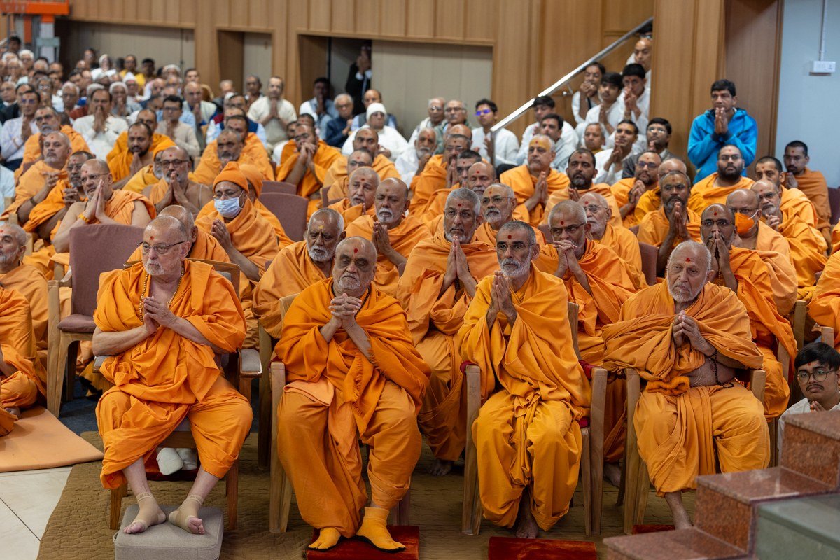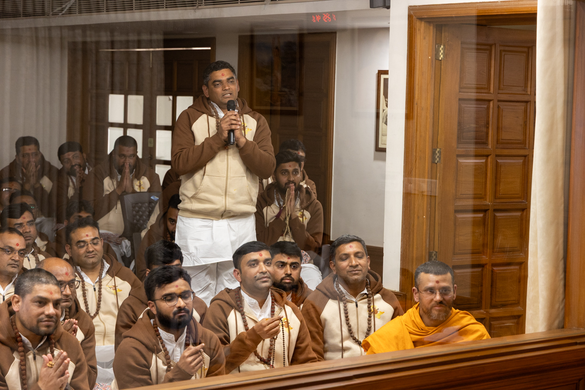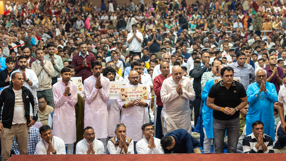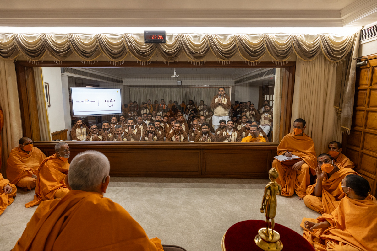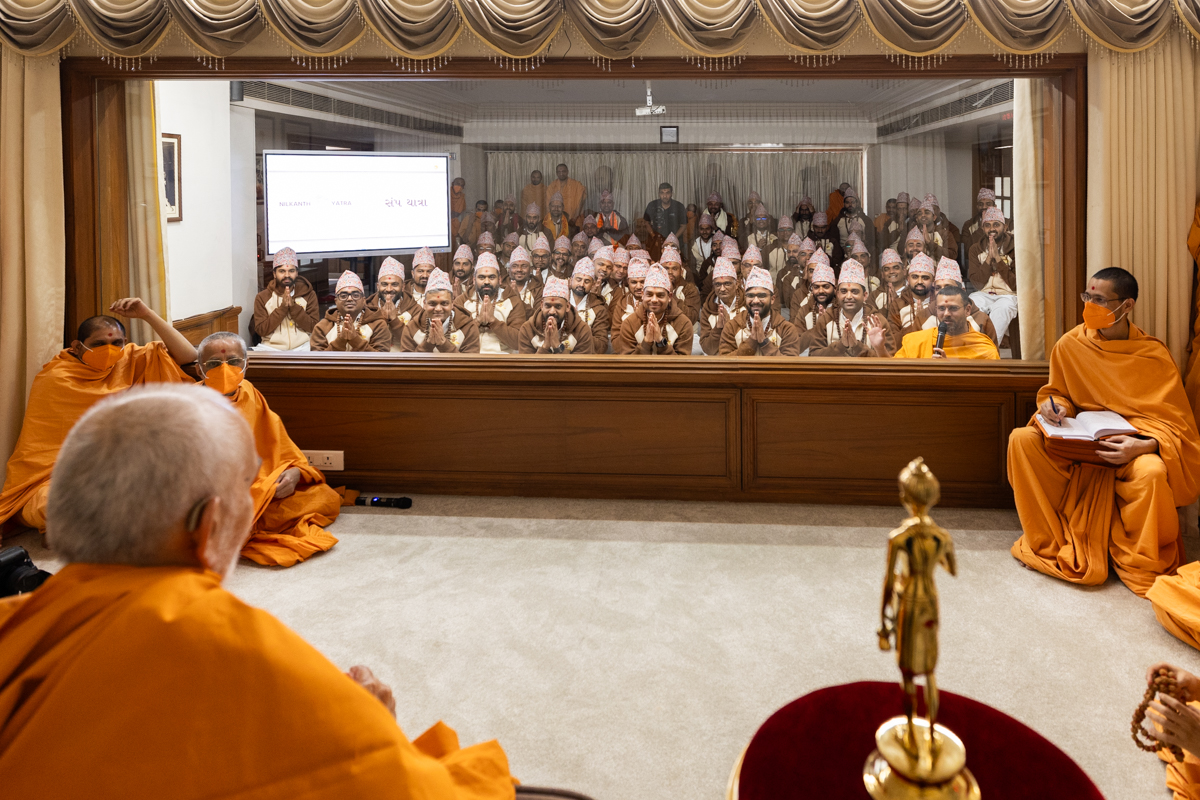 Pujya Ishwarcharan Swami, swamis and devotees doing darshan of Swamishri