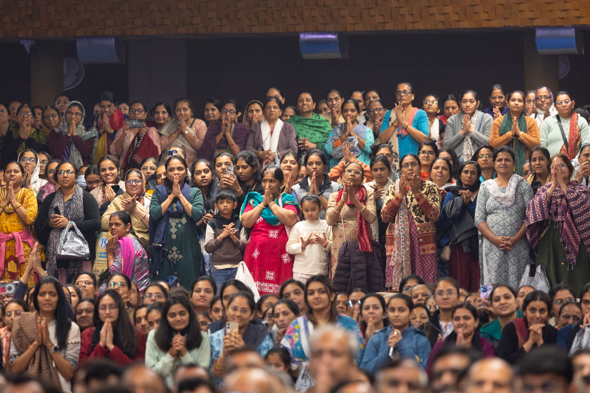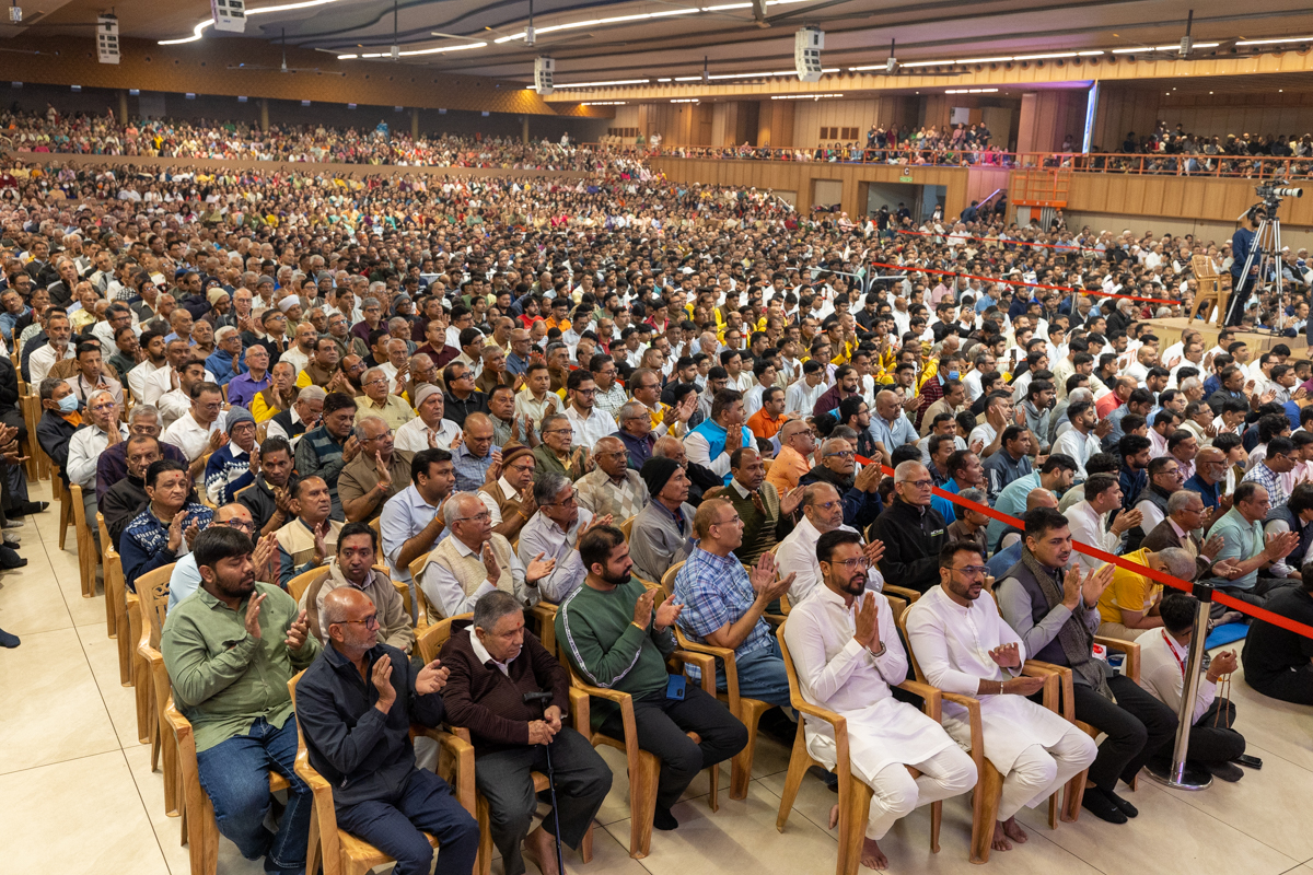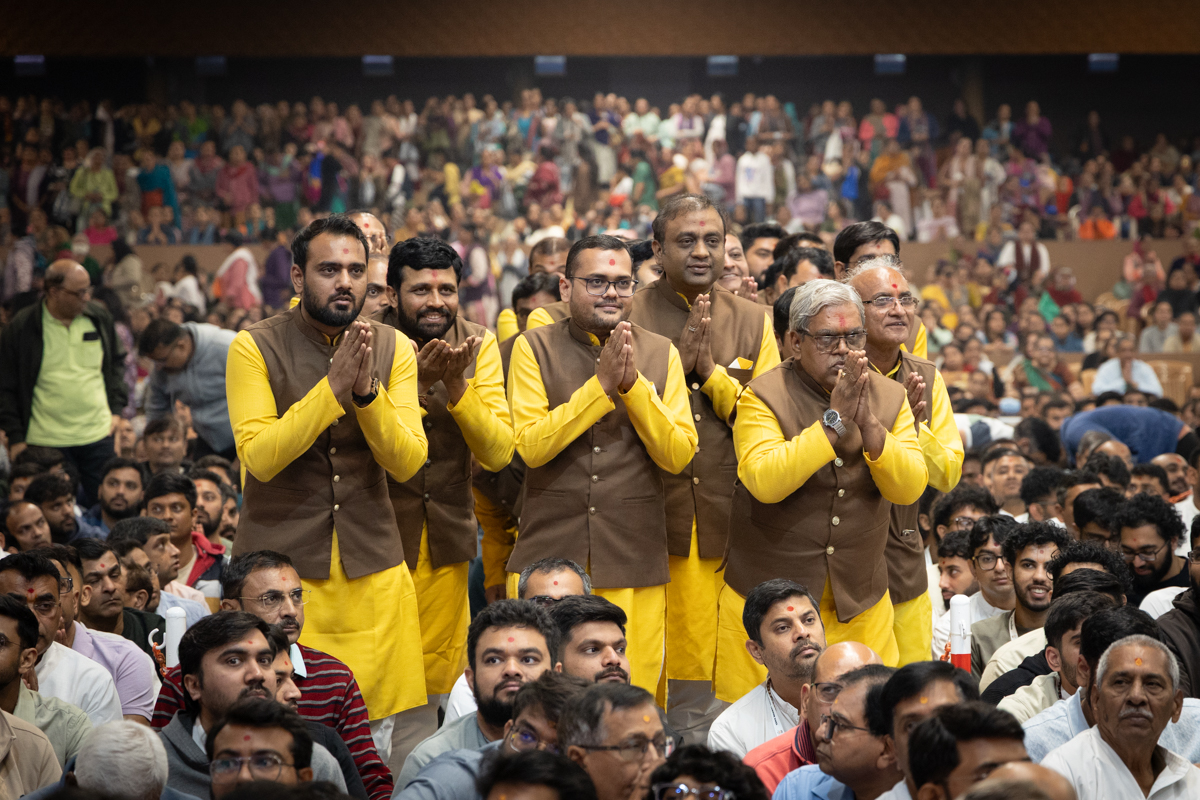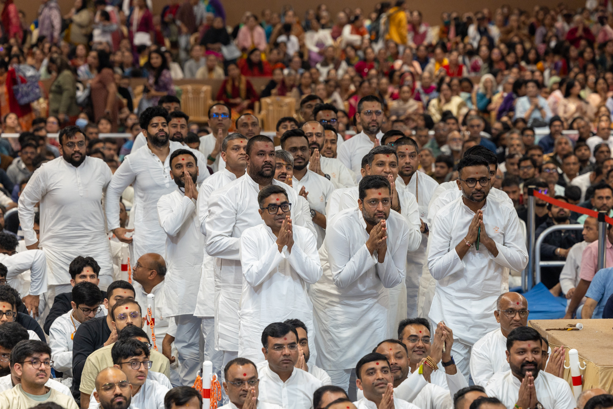 Pujya Ishwarcharan Swami, swamis and devotees doing darshan of Swamishri