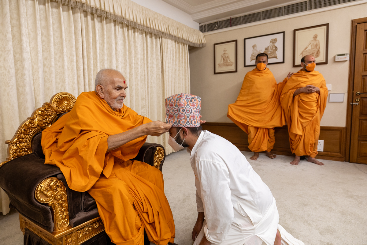 Swamishri places a traditional cap (topi) on a sadhak's head