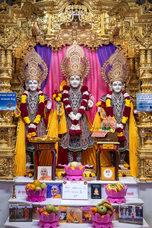 Swamishri engrossed in darshan of Bhagwan Swaminarayan, Aksharbrahma Gunatitanand Swami and Shri Gopalanand Swami