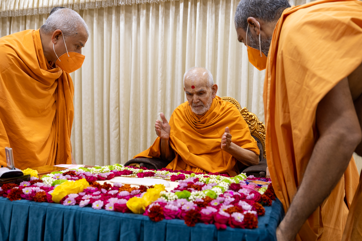 Swamishri guides swamis to align his puja table