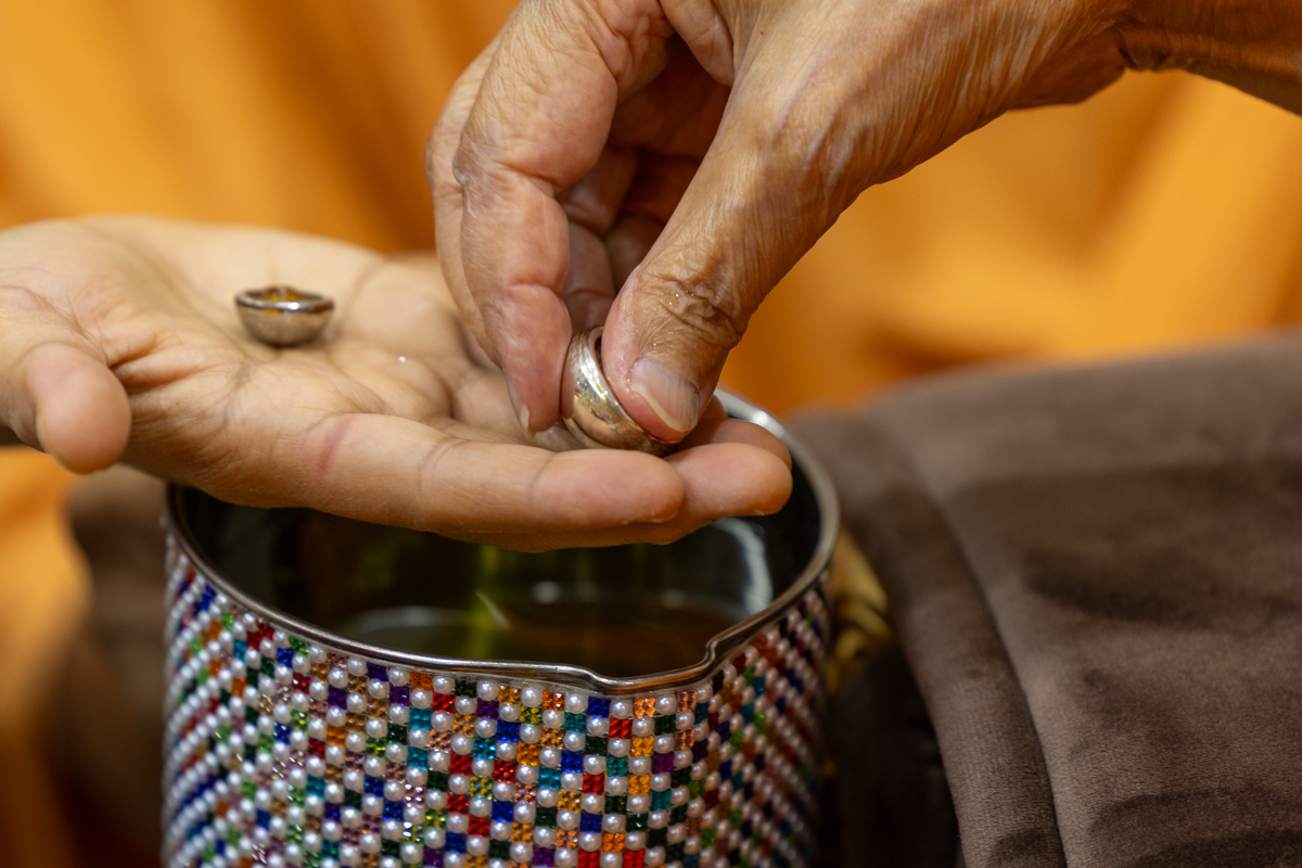 Swamishri sanctifies water with the holy relics of Bhagwan Swaminarayan and the Guru Parampara