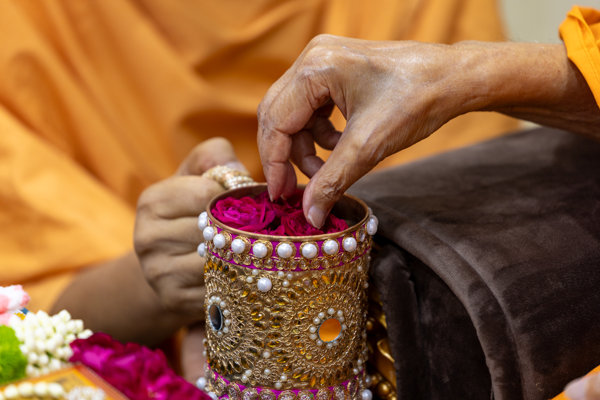 Swamishri adds flowers to the sanctified water