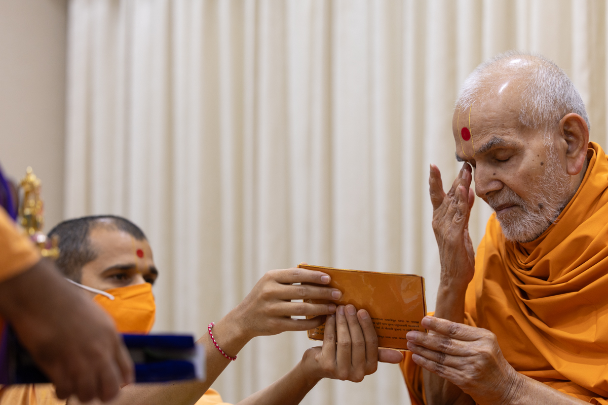 Swamishri touches his eyes after reverently touching the holy charanarvind of Shri Akshar-Purushottam Maharaj