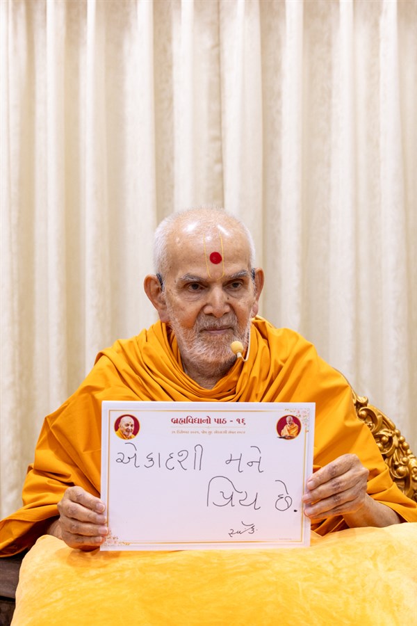 Swamishri displays a message for Dhanurmas
