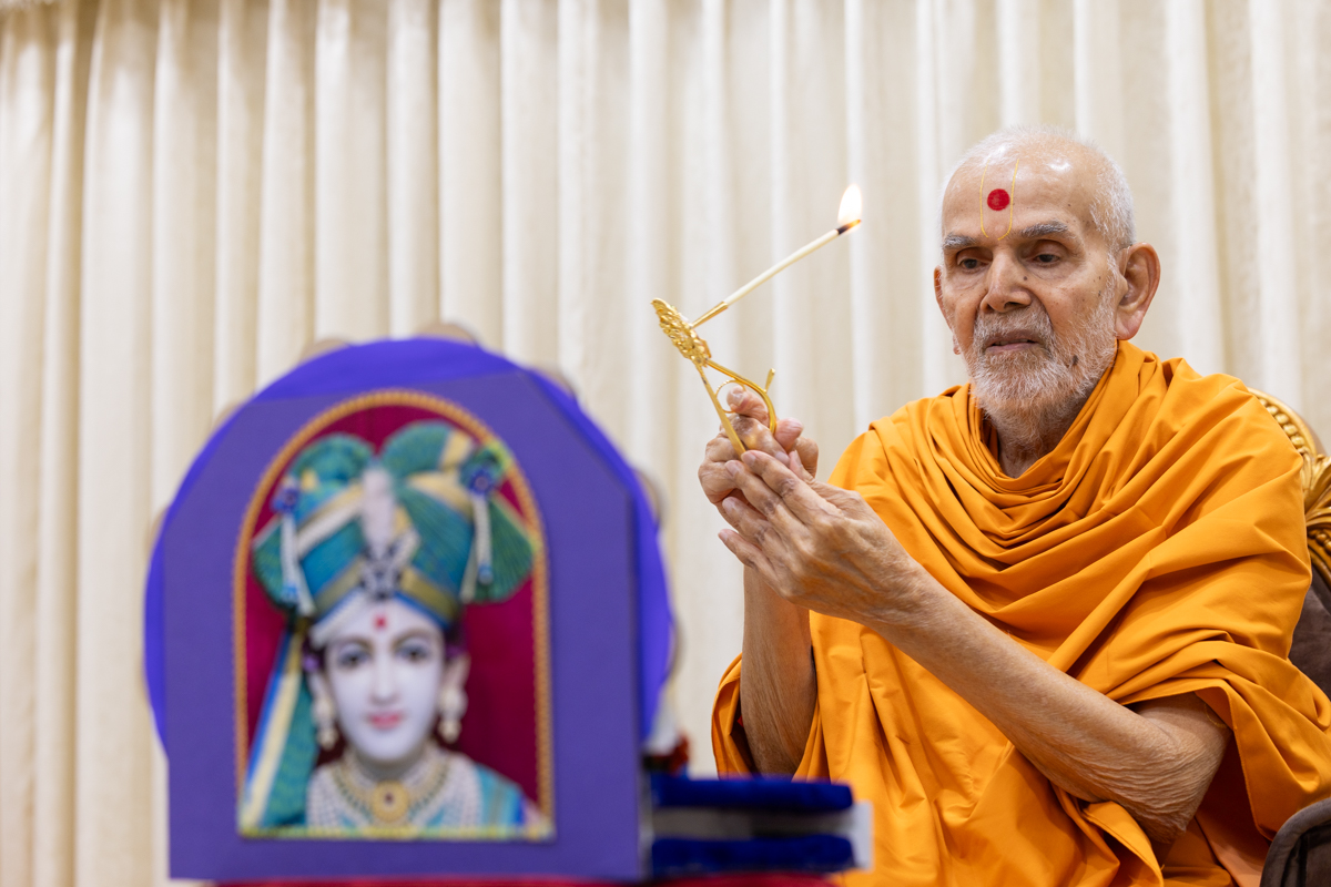 Swamishri performs the morning arti