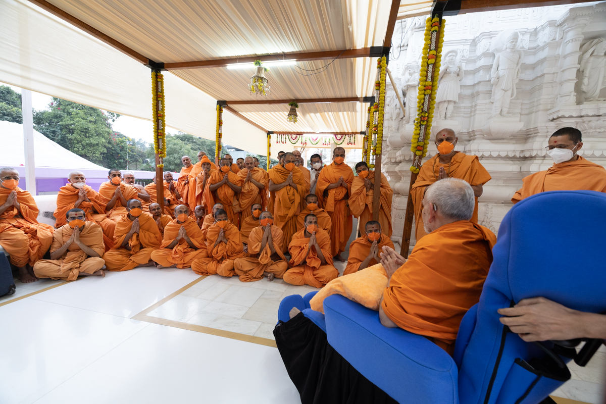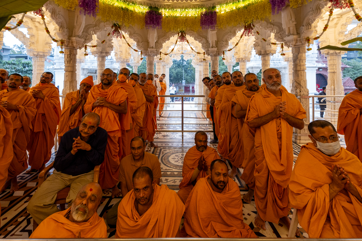 Swamis and devotees doing darshan of Swamishri