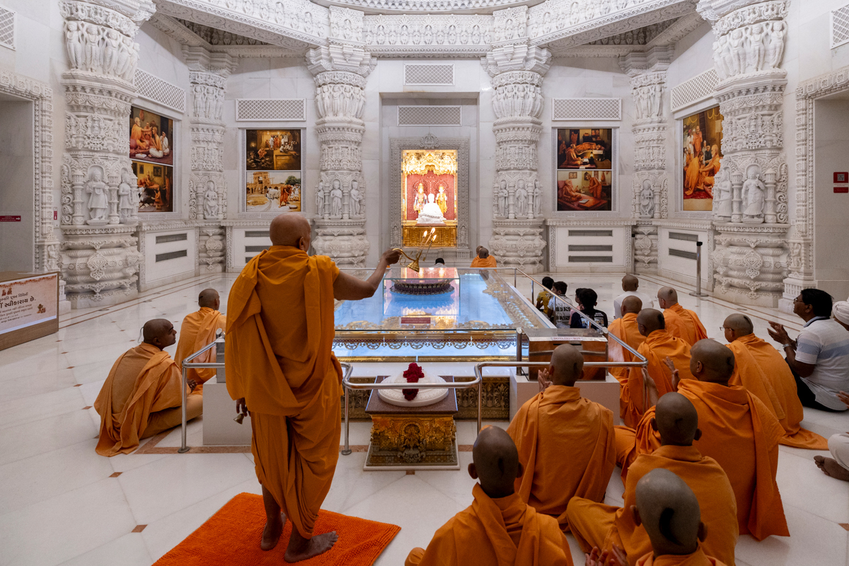 Pujya Tyagvallabh Swami performs the morning arti at Pramukh Swami Smruti Mandir