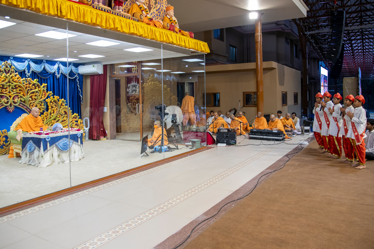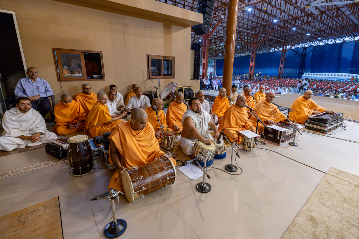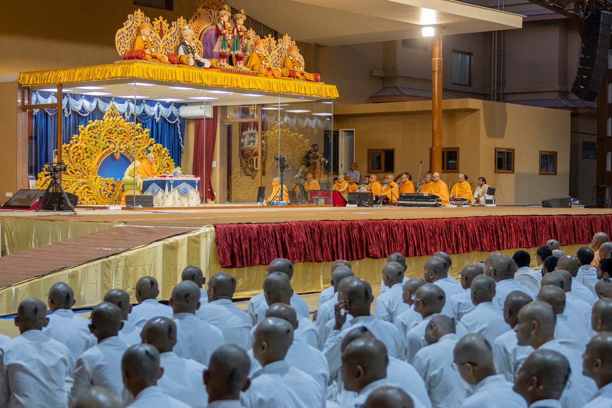 Swamis sing kirtans in Swamishri's daily puja