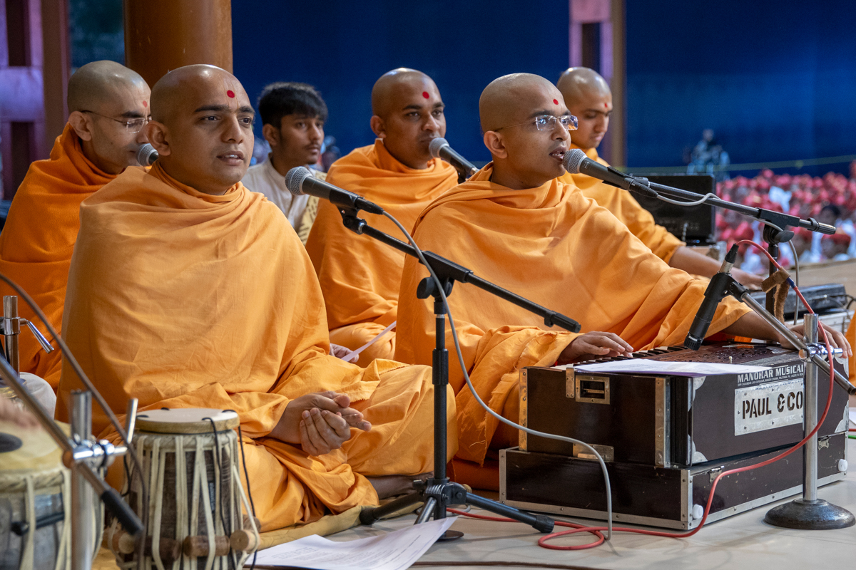 Swamis sing kirtans at the beginning of the welcome assembly in the evening
