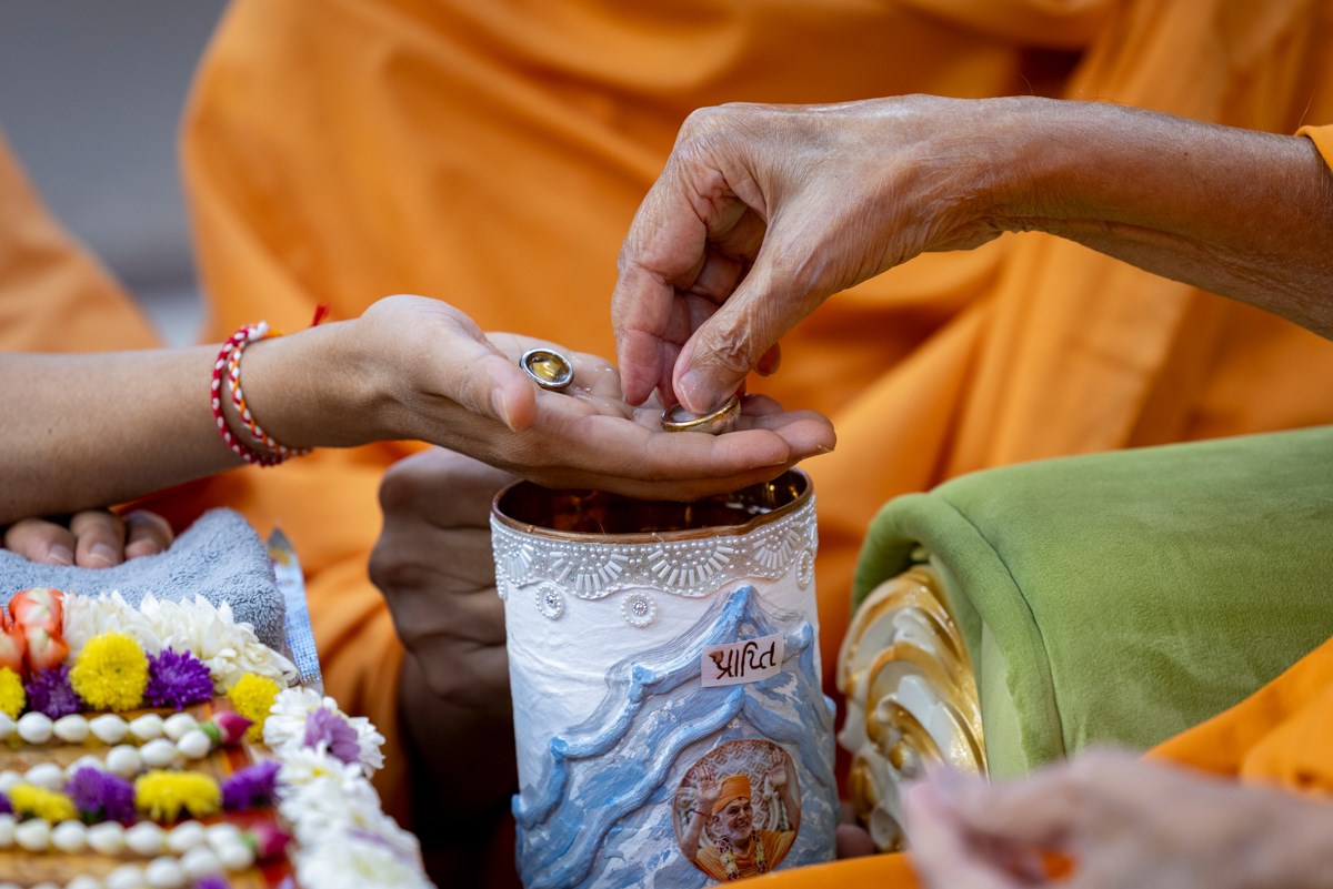 Swamishri sanctifies water with the holy relics of Bhagwan Swaminarayan and the Guru Parampara