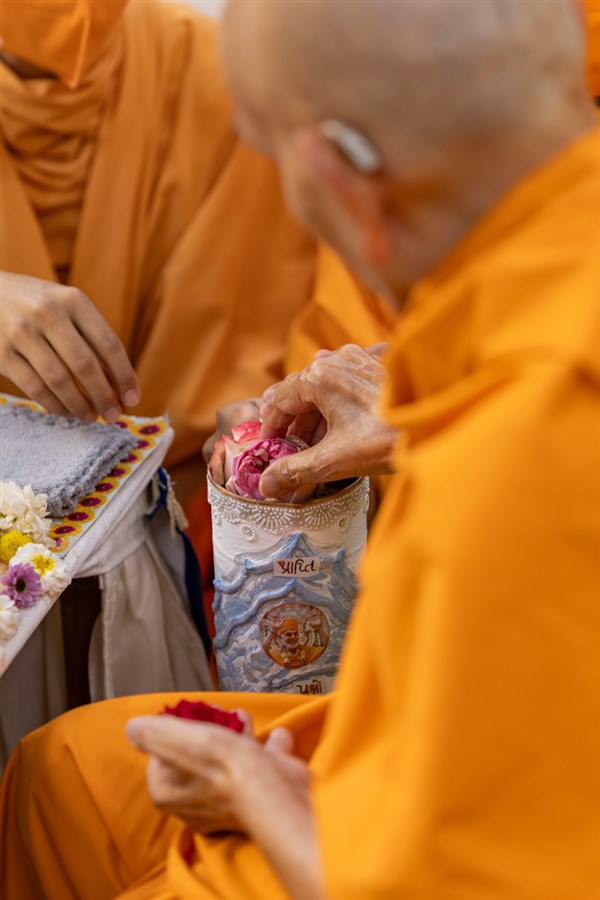 Swamishri adds flowers to the sanctified water
