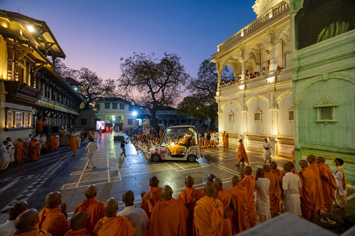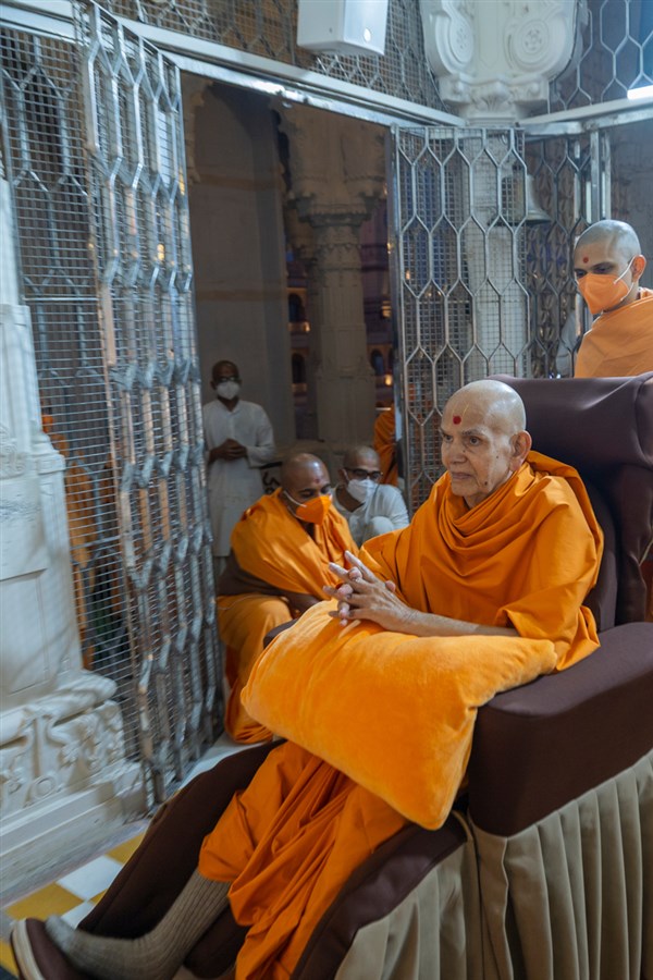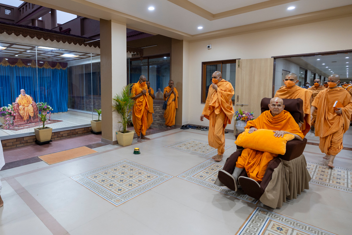 Swamishri on his way for Thakorji's darshan in the evening