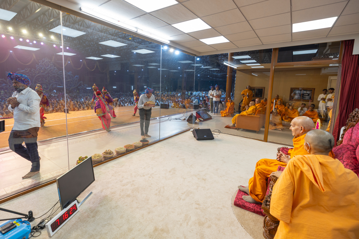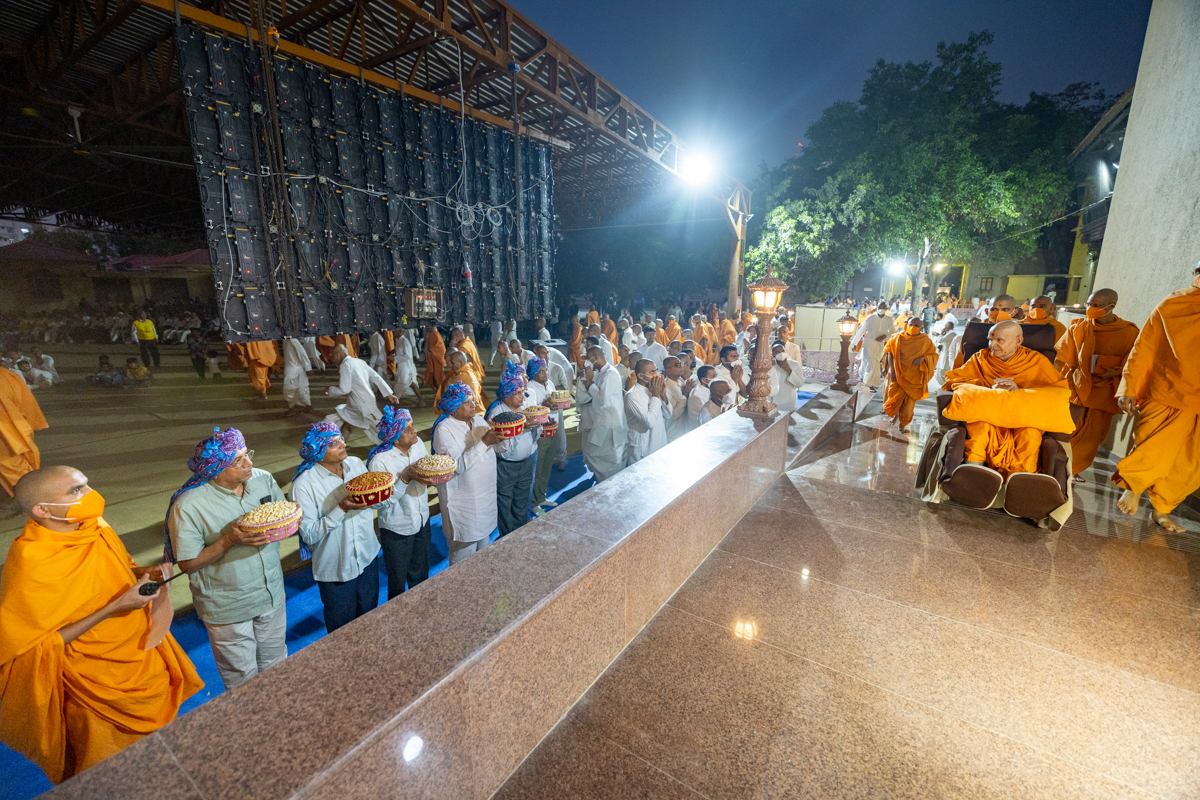 Devotees welcome Swamishri with sweets