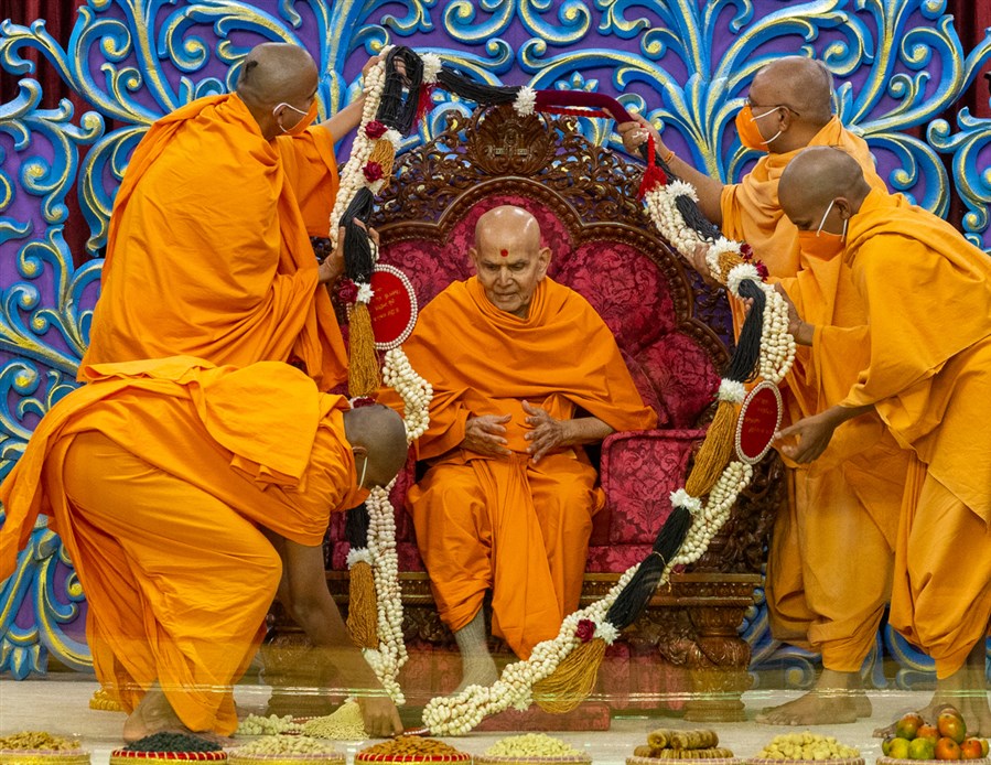 Swamis welcome Swamishri with a garland