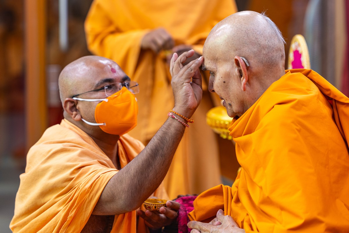 Param Pujya Mahant Swami Maharaj applies a tilak on his forehead