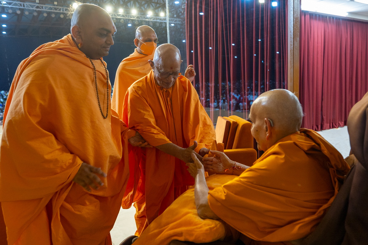 Pujya Tyagvallabh Swami greets Swamishri
