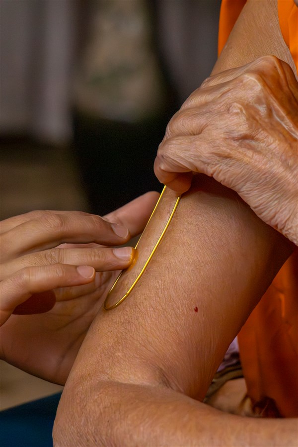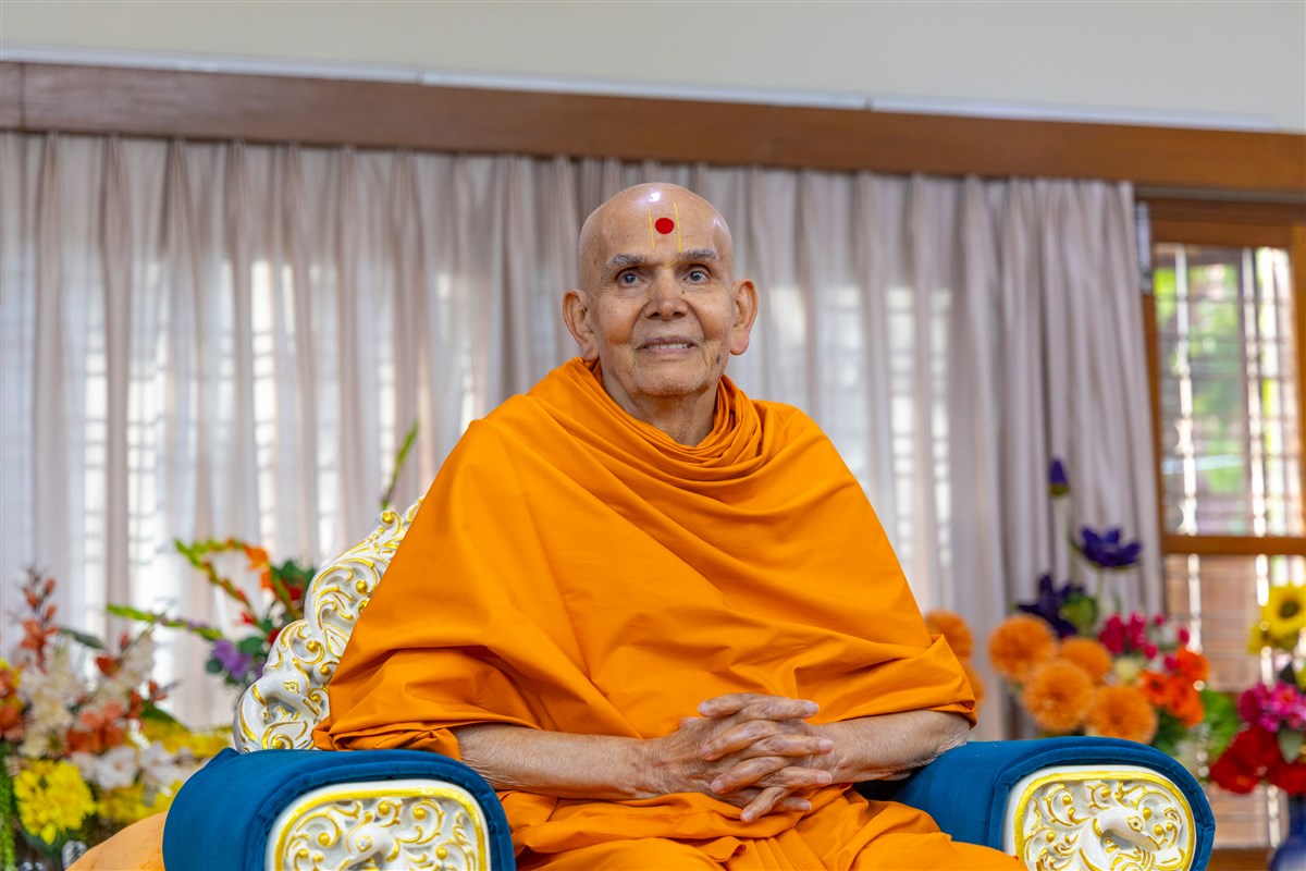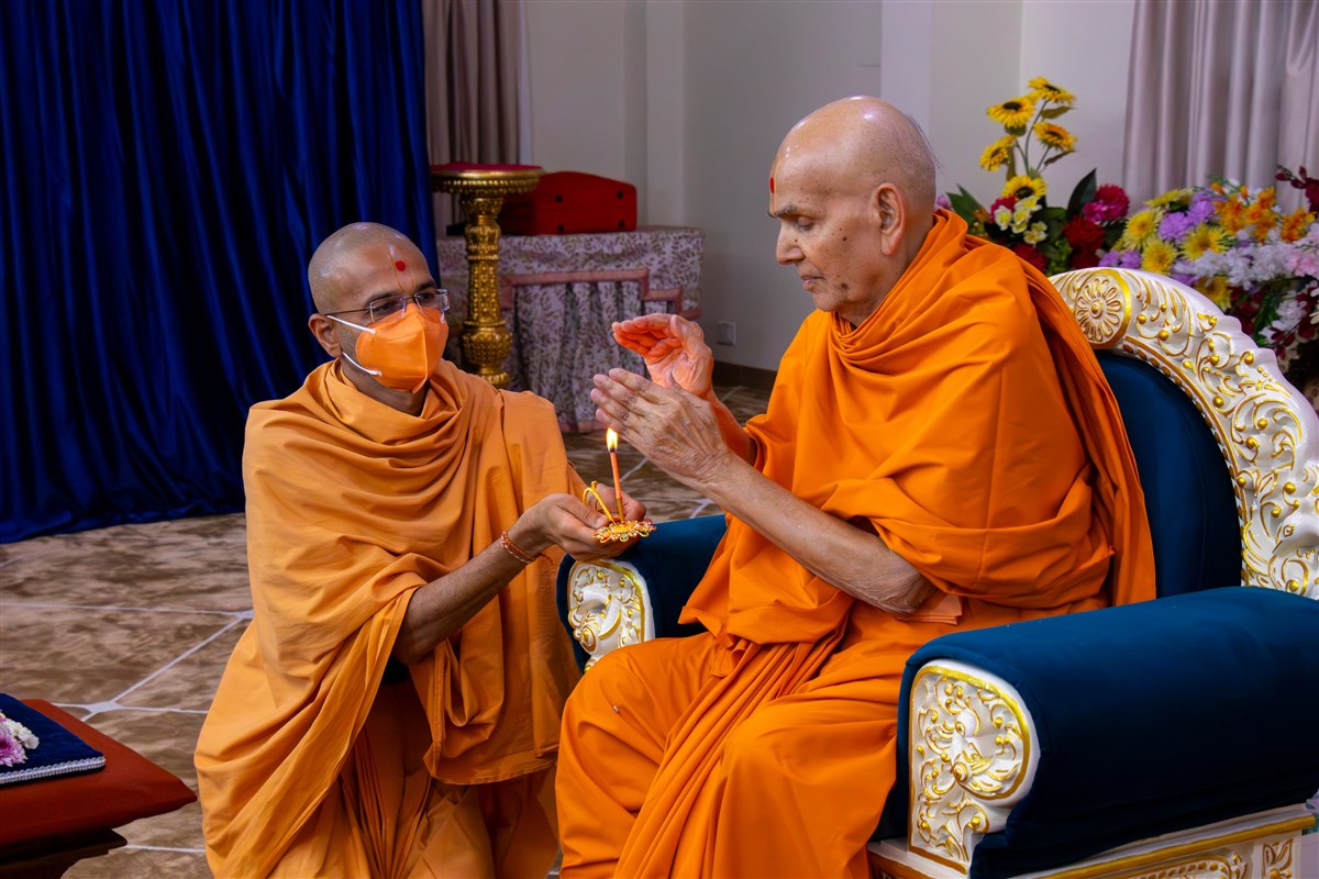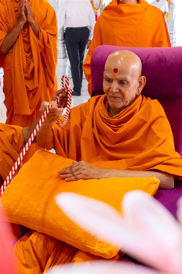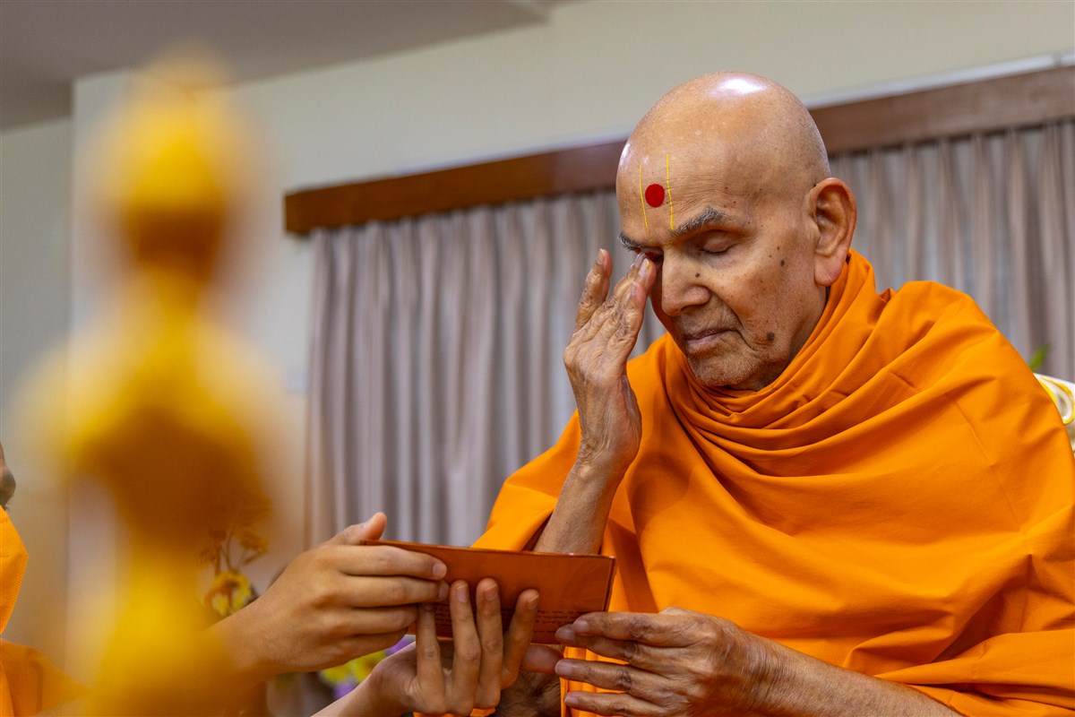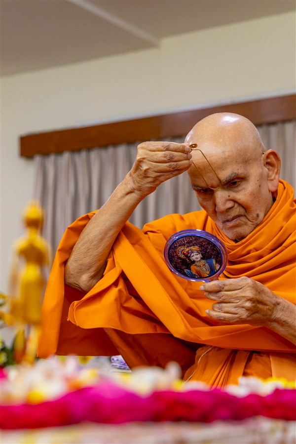 Param Pujya Mahant Swami Maharaj applies a tilak on his forehead