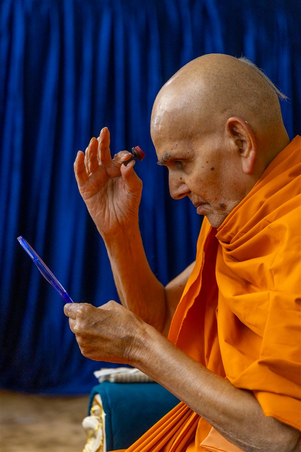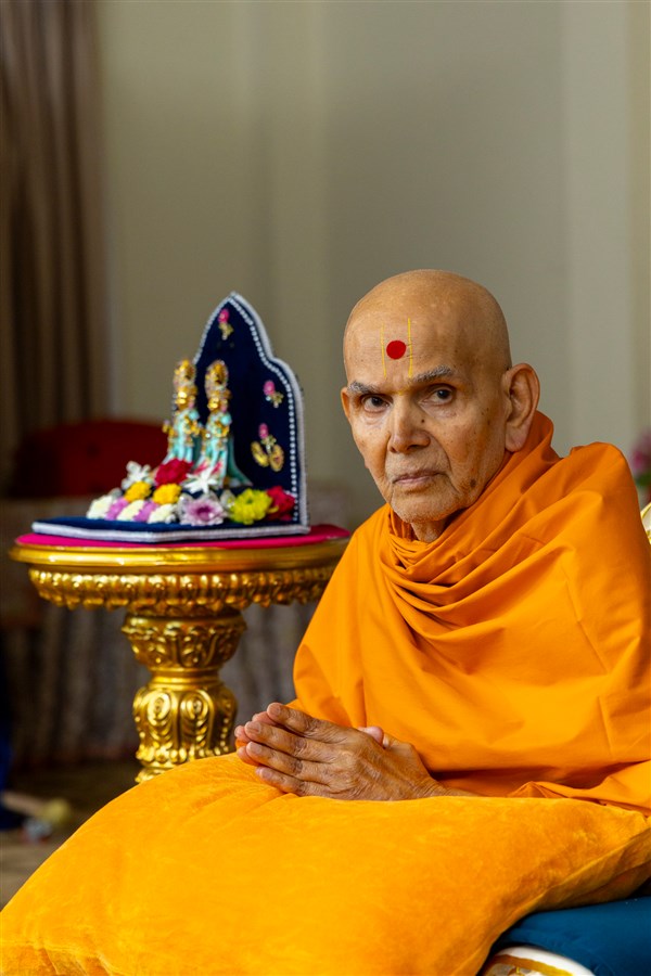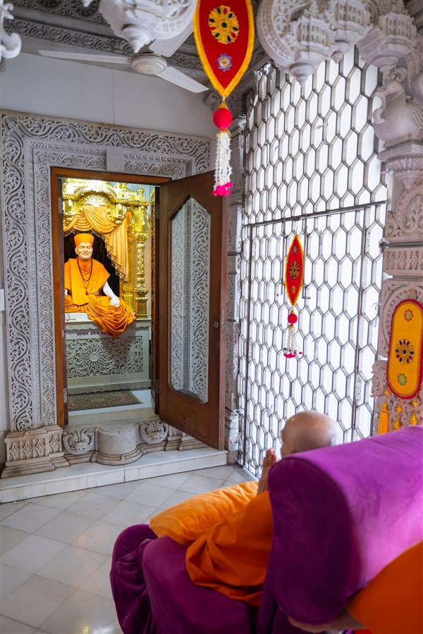 Swamishri engrossed in darshan of Shri Harikrishna Maharaj and Shri Gunatitanand Swami Maharaj