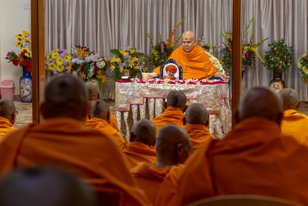 Swamishri engrossed in darshan of Brahmaswarup Pramukh Swami Maharaj