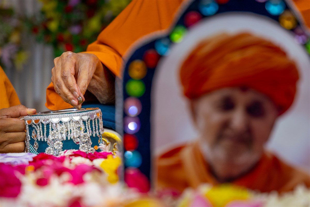 Swamishri sanctifies water with the holy relics of Bhagwan Swaminarayan and the Guru Parampara