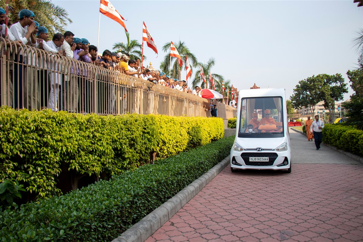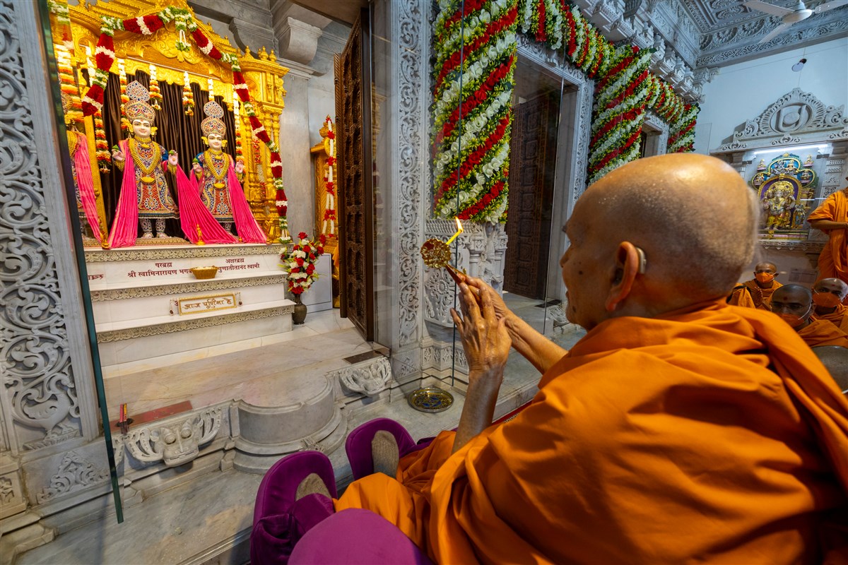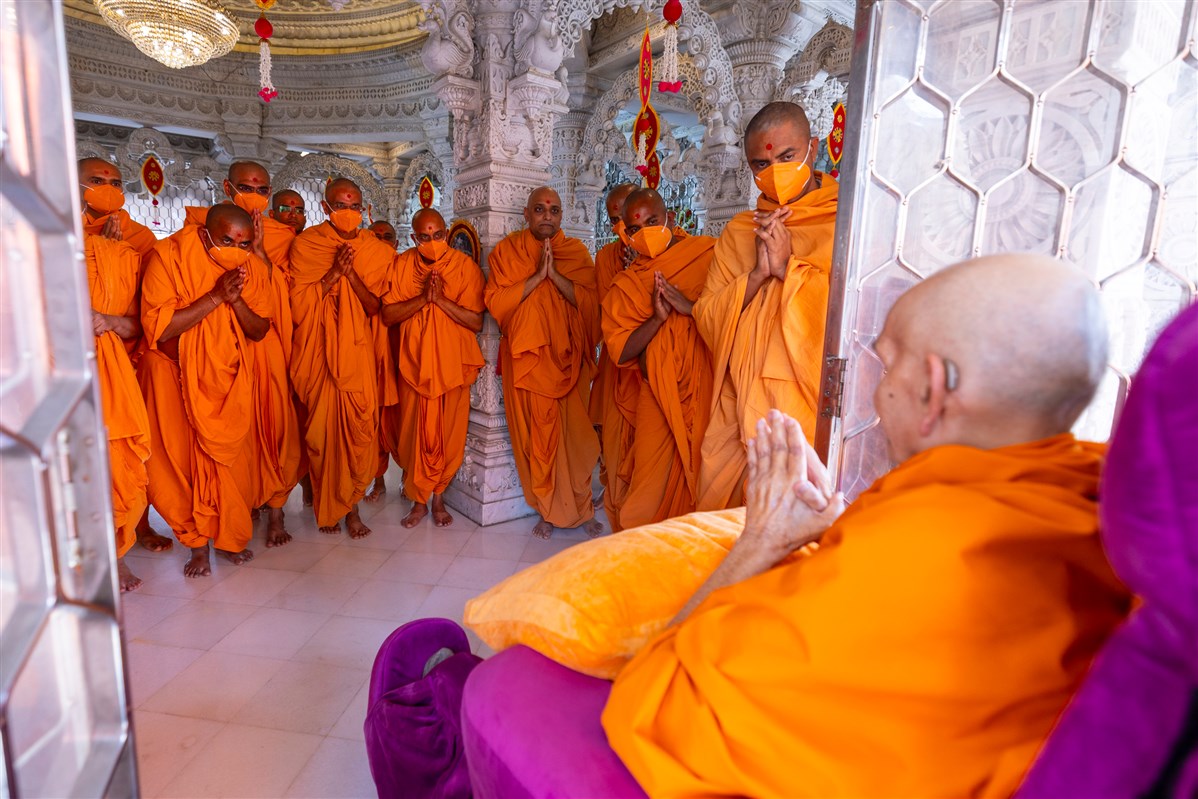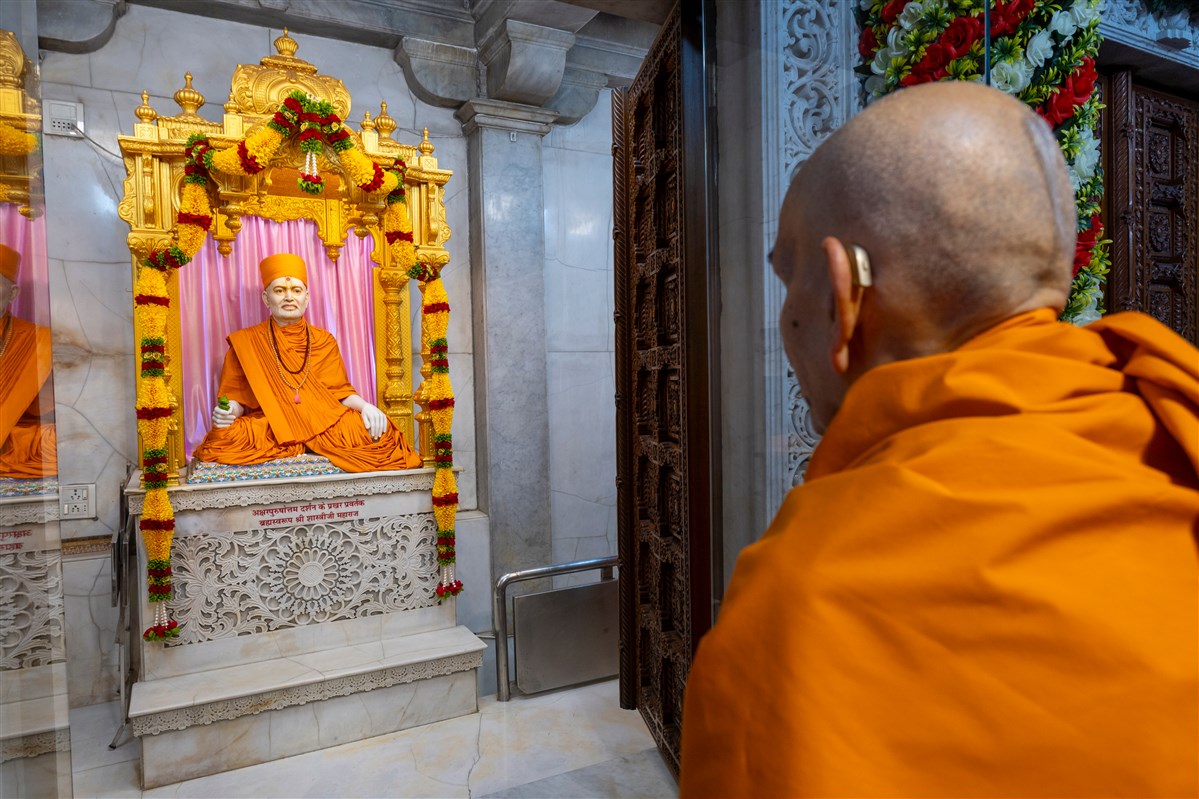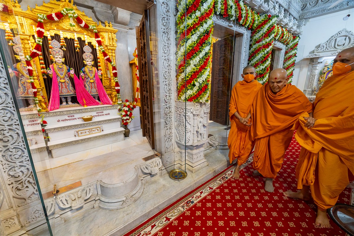 Swamishri arrives for darshan of Bhagwan Swaminarayan, Aksharbrahma Gunatitanand Swami