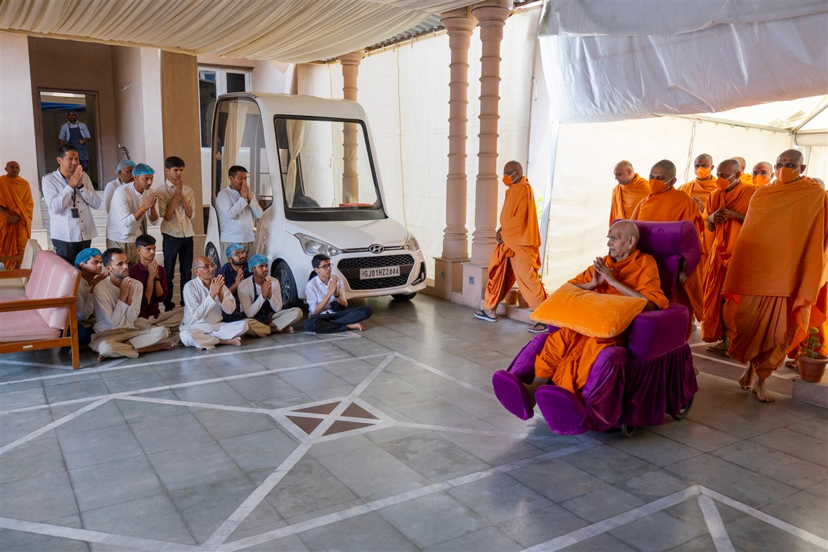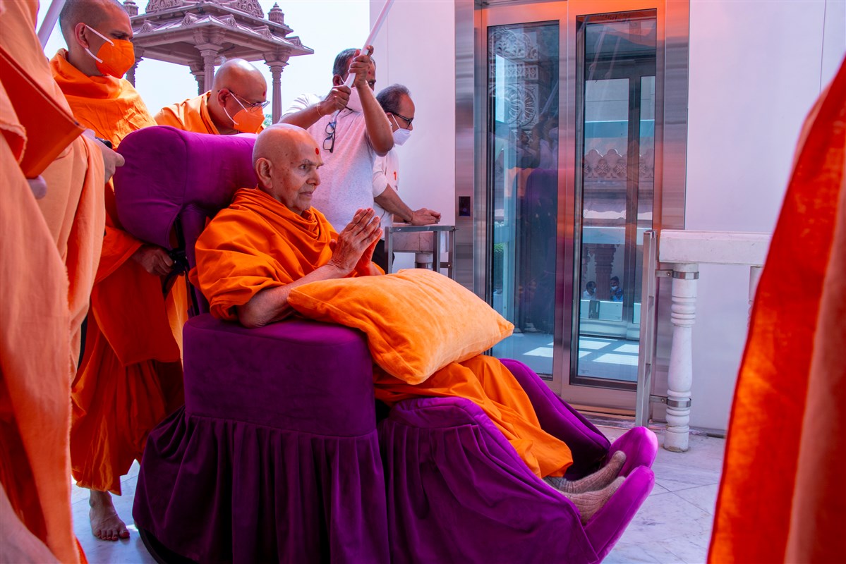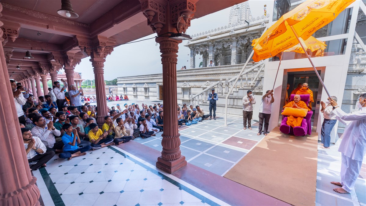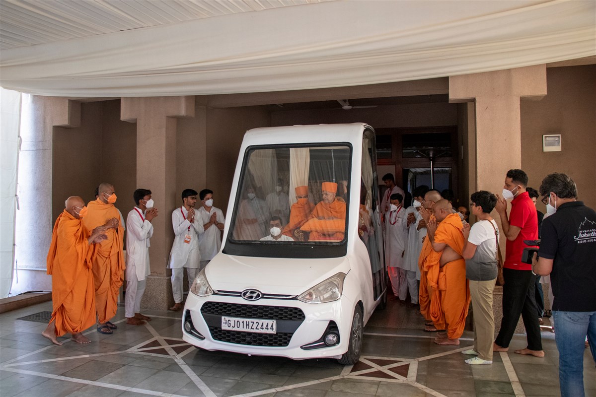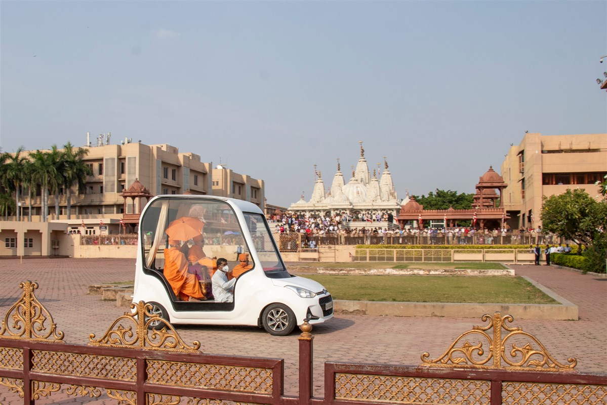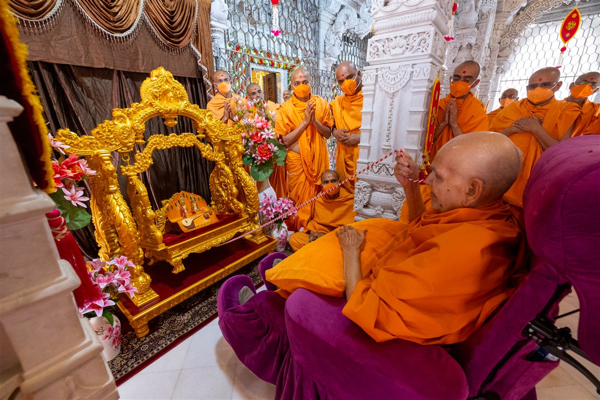 Swamishri arrives for darshan of Bhagwan Swaminarayan, Aksharbrahma Gunatitanand Swami