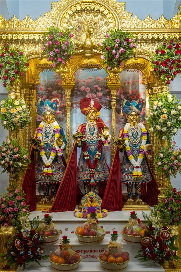 Swamishri engrossed in darshan of Bhagwan Swaminarayan, Aksharbrahma Gunatitanand Swami and Shri Gopalanand Swami