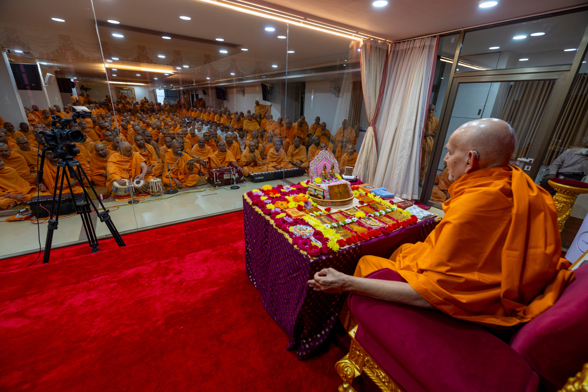 Senior swamis and swamis doing Swamishri's puja darshan