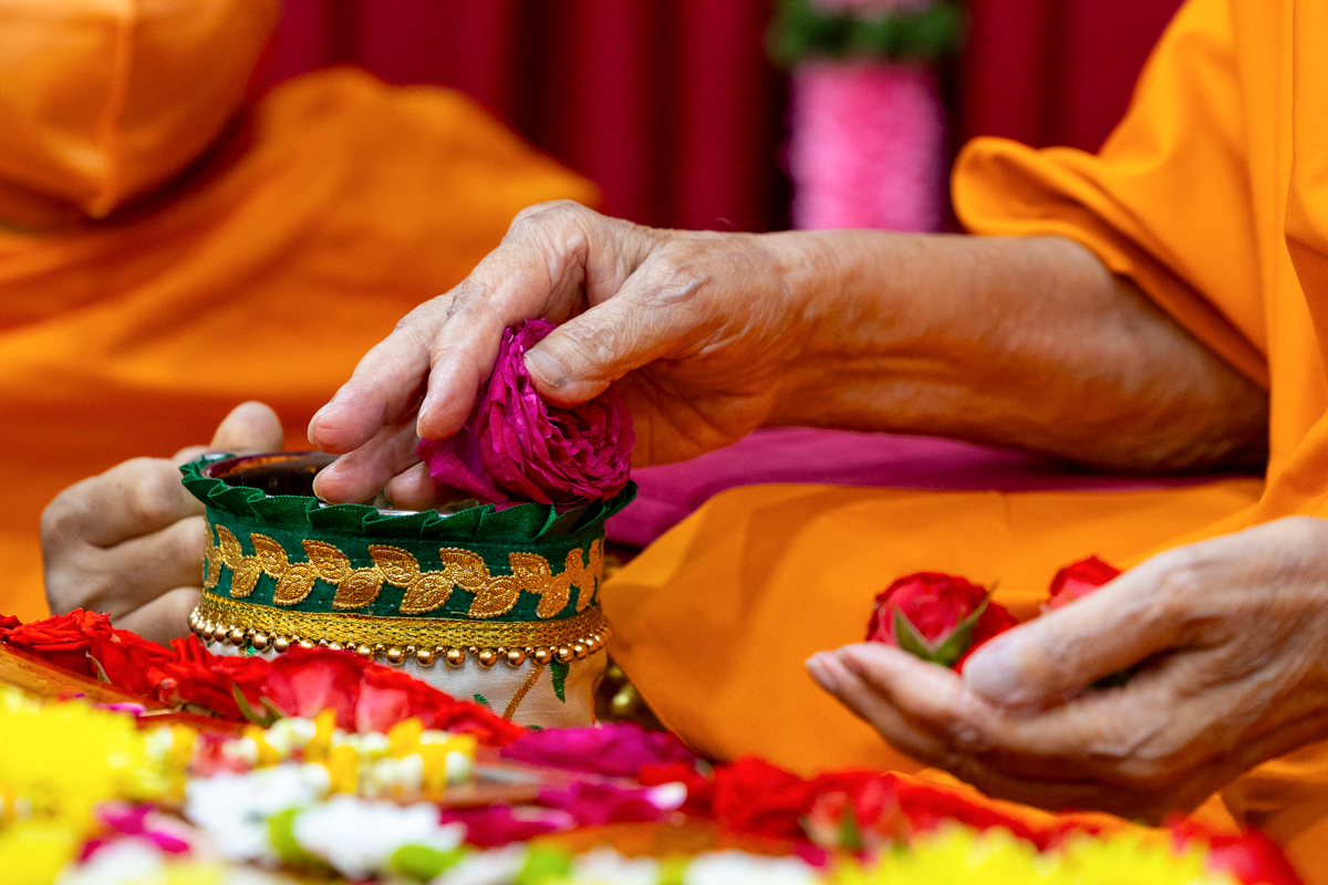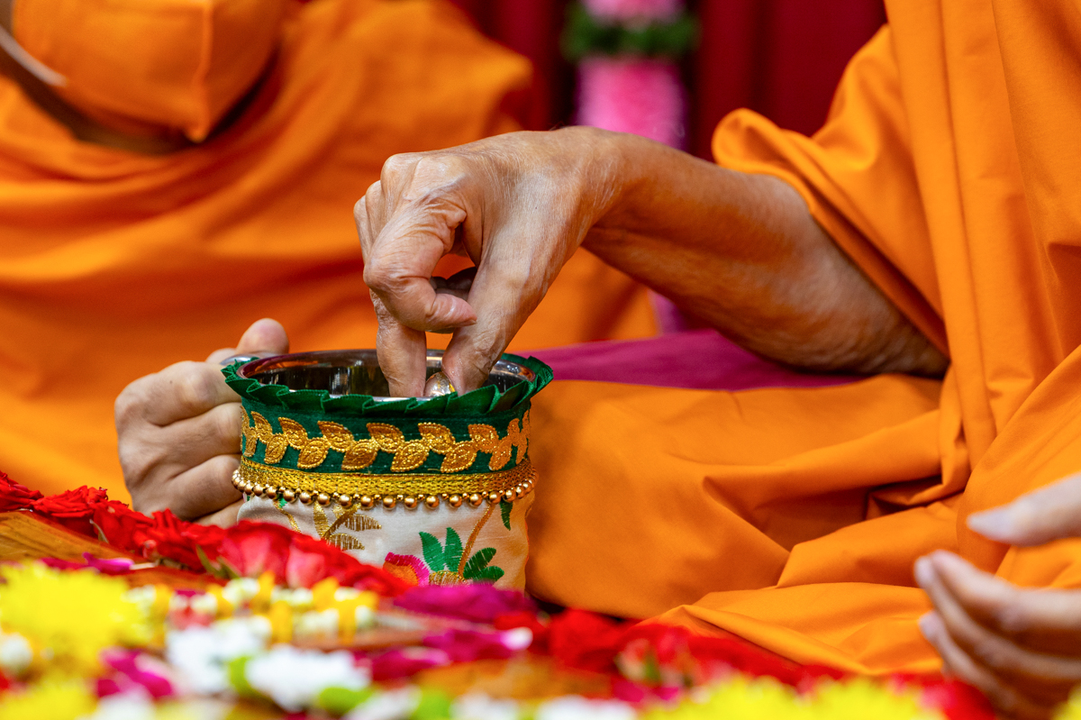 Swamishri adds flowers to the sanctified water