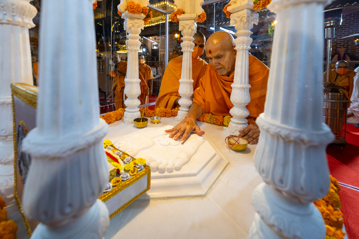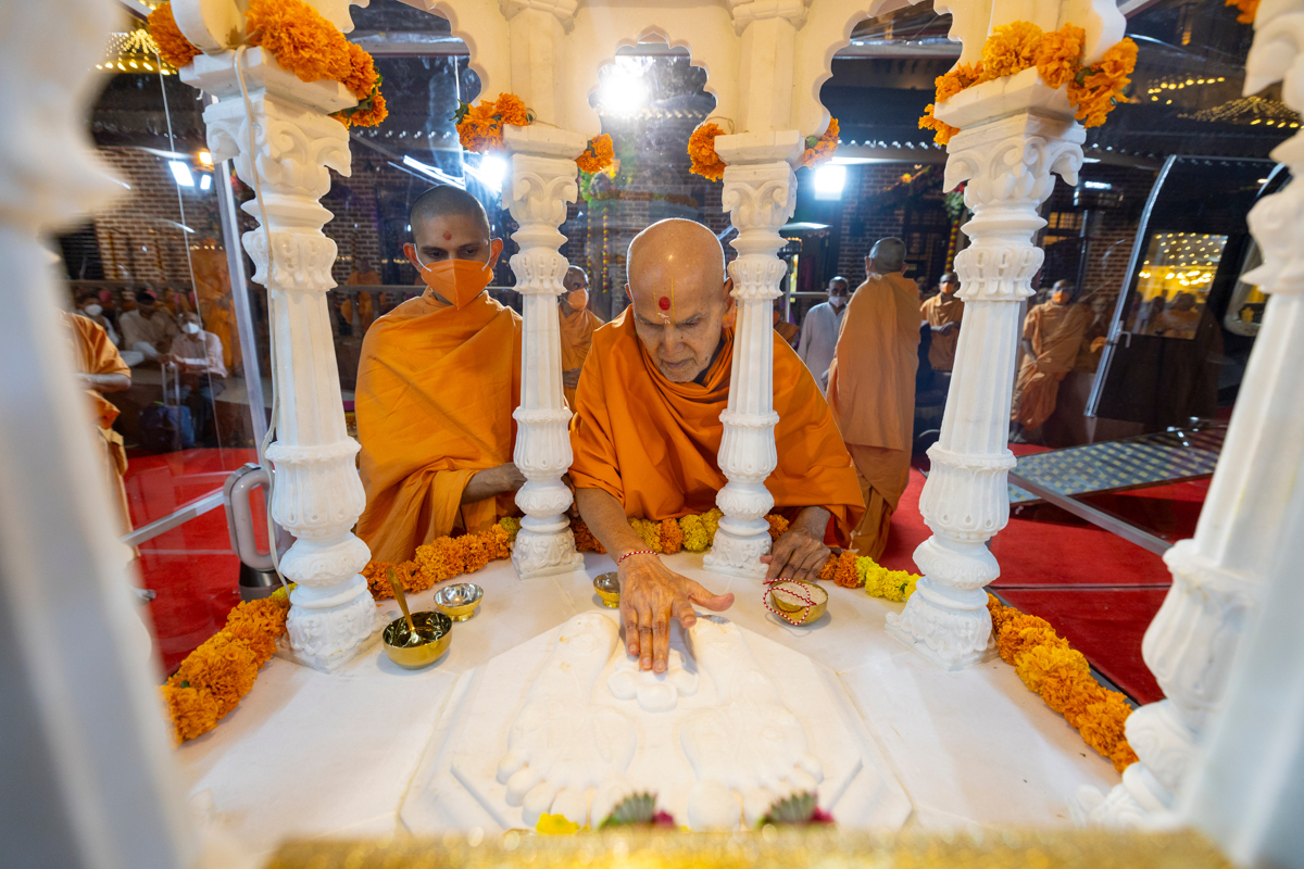 Swamishri performs pujan of the holy charanarvind of Bhagwan Swaminarayan