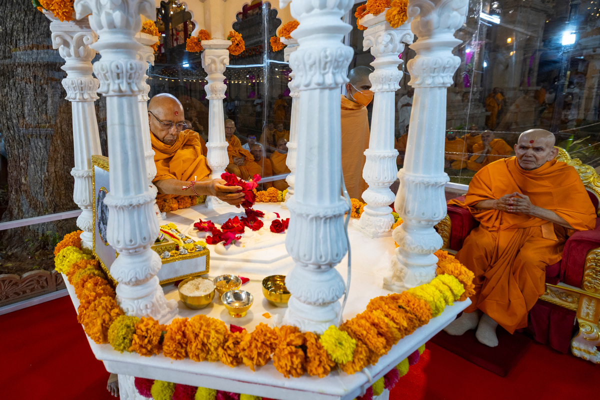 Pujya Tyagvallabh Swami showers flower petals on the holy charanarvind of Bhagwan Swaminarayan