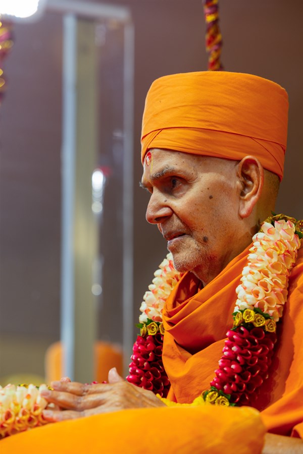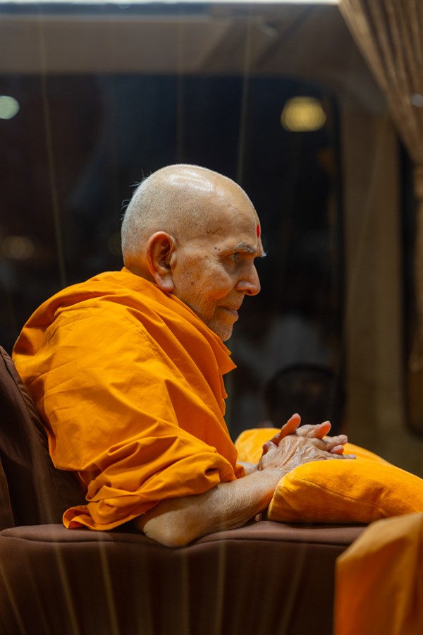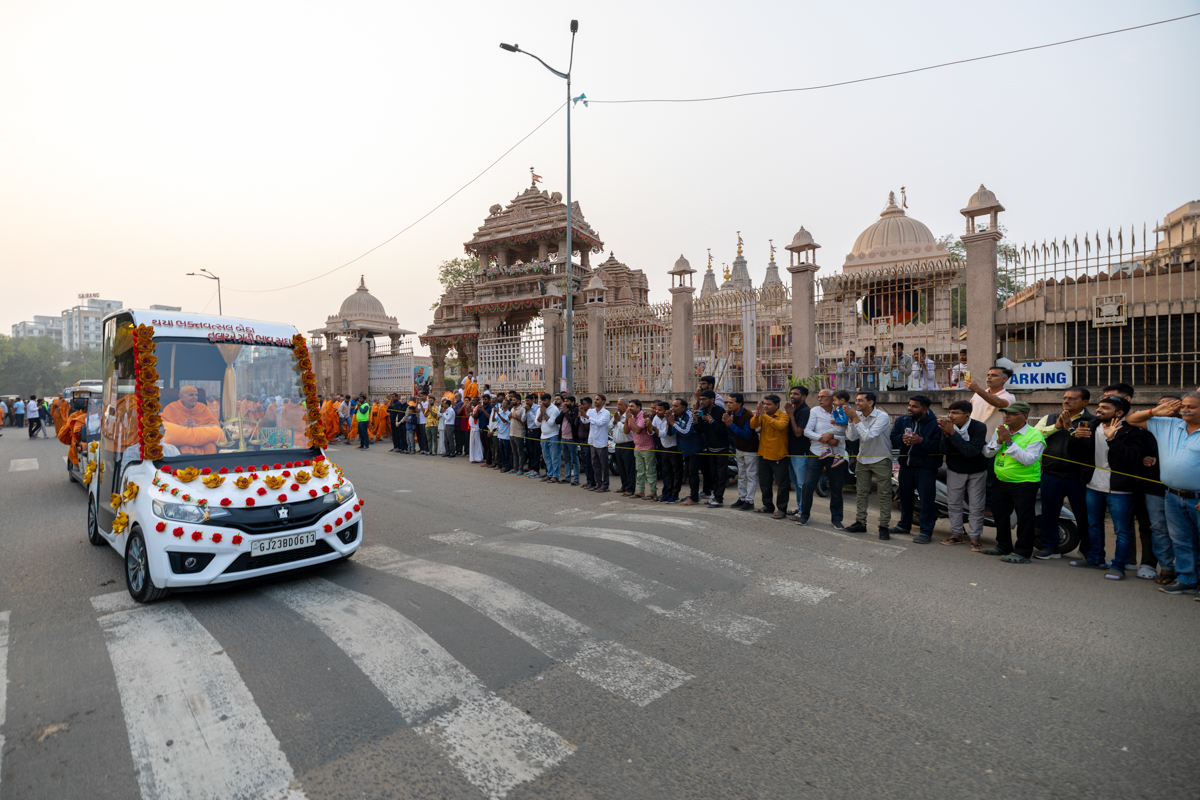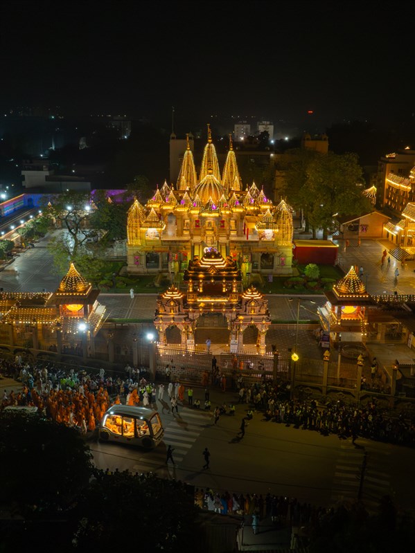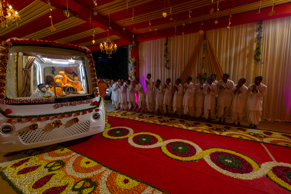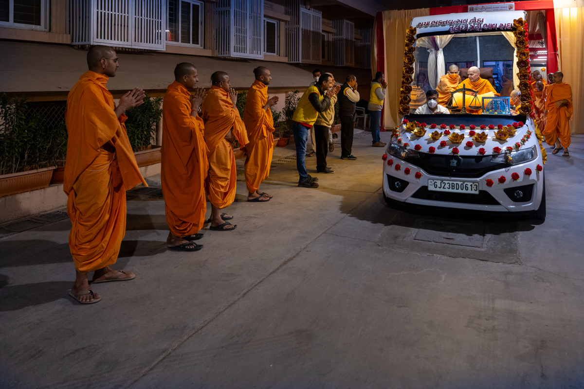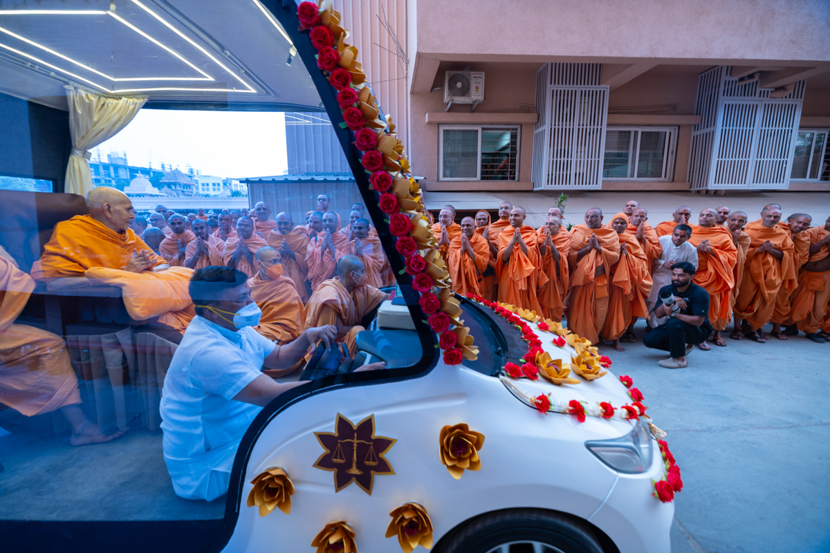 Swamishri returns to BAPS Shri Swaminarayan Mandir, Atladara (Vadodara), after his daily puja