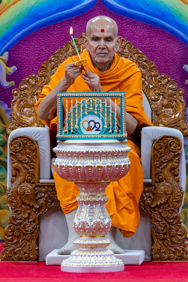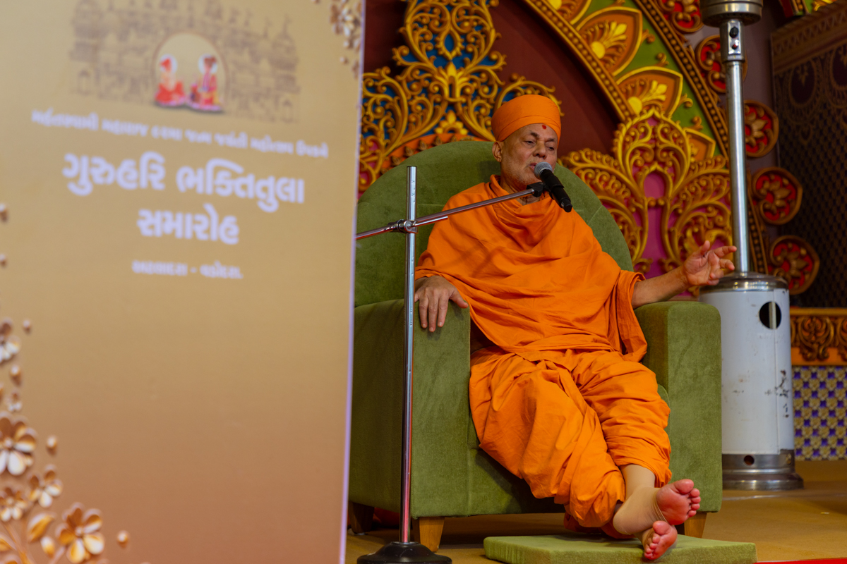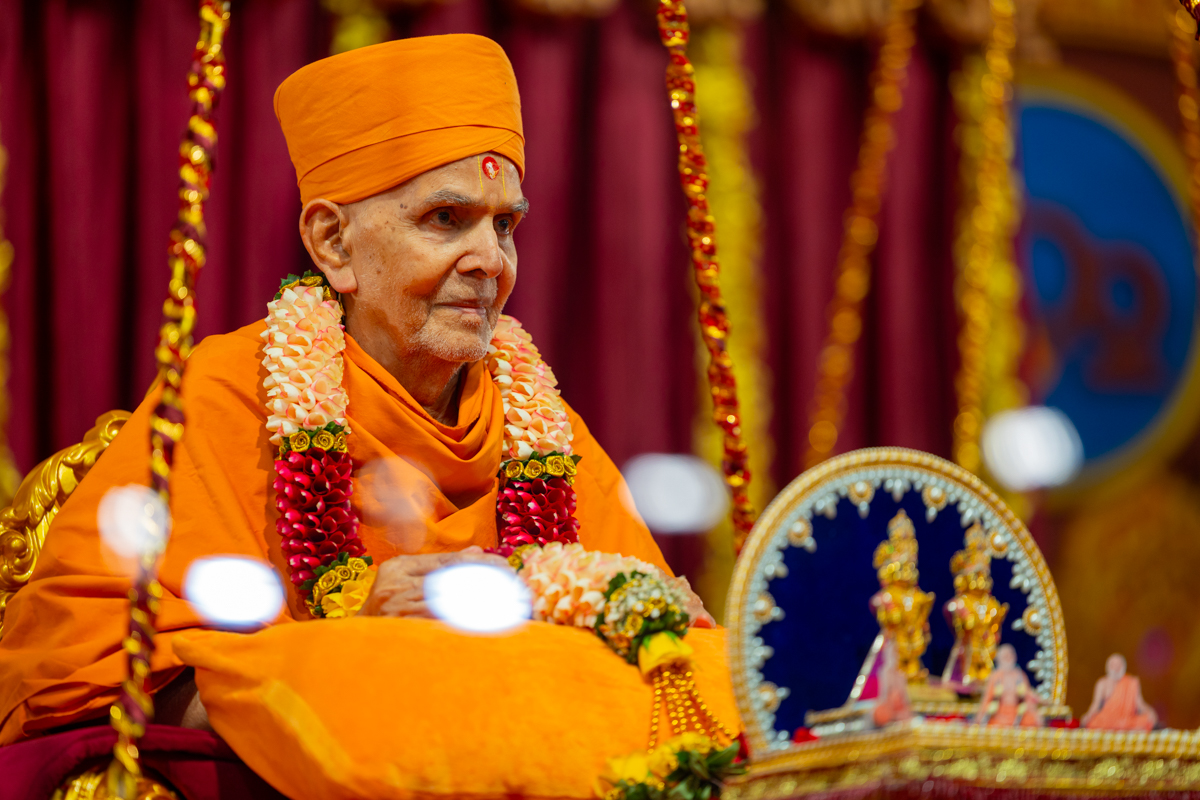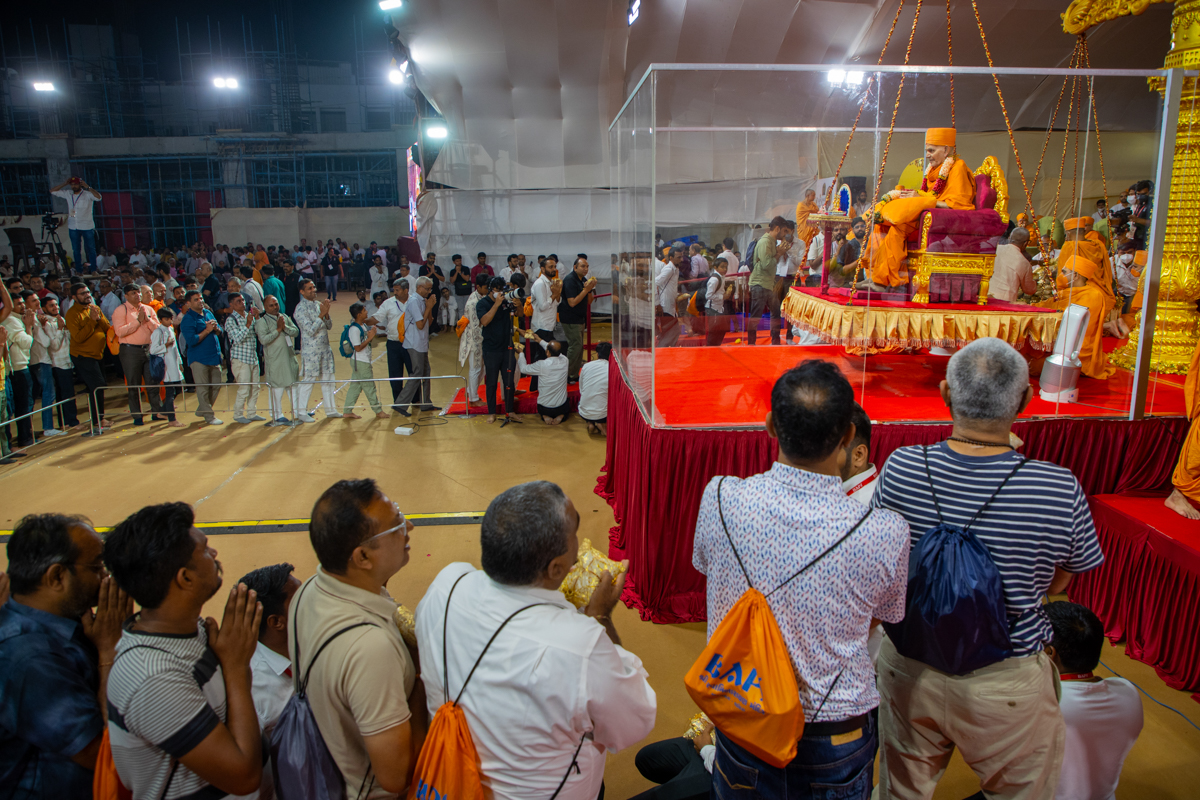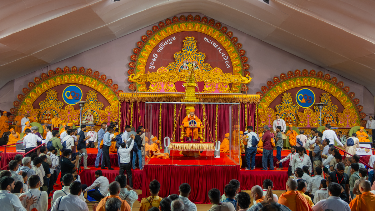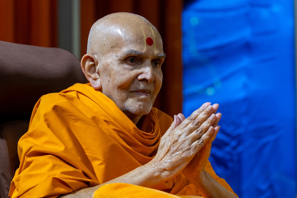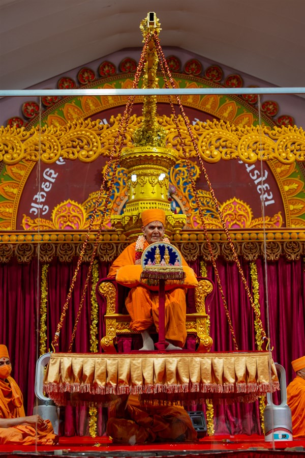 Swamishri returns to BAPS Shri Swaminarayan Mandir, Atladara (Vadodara), after his daily puja