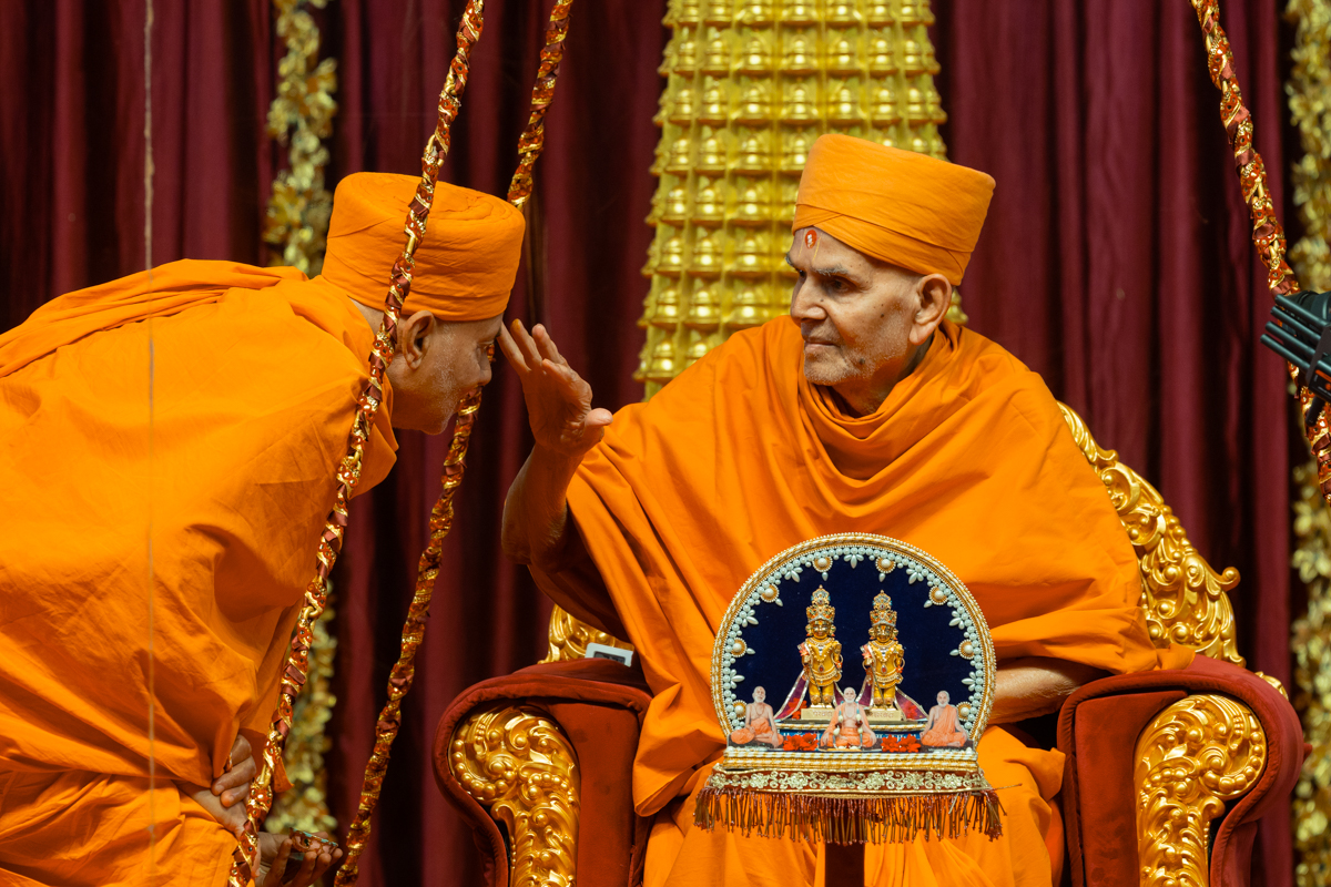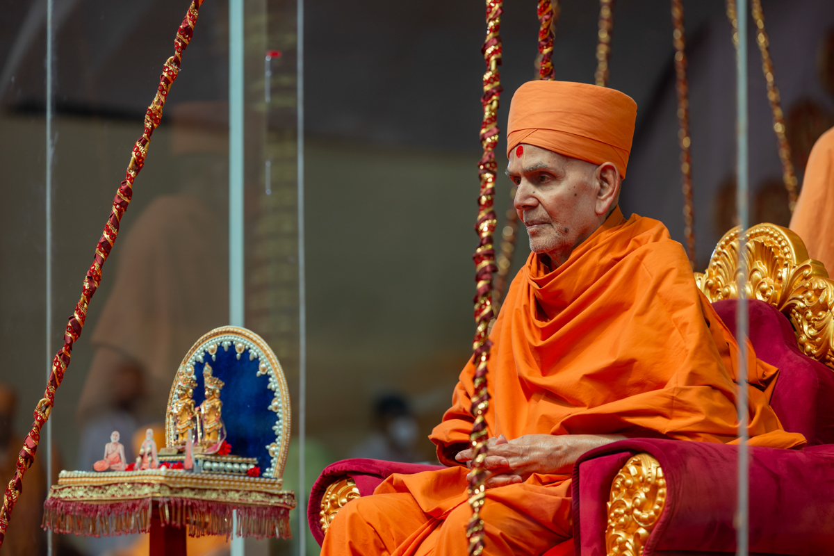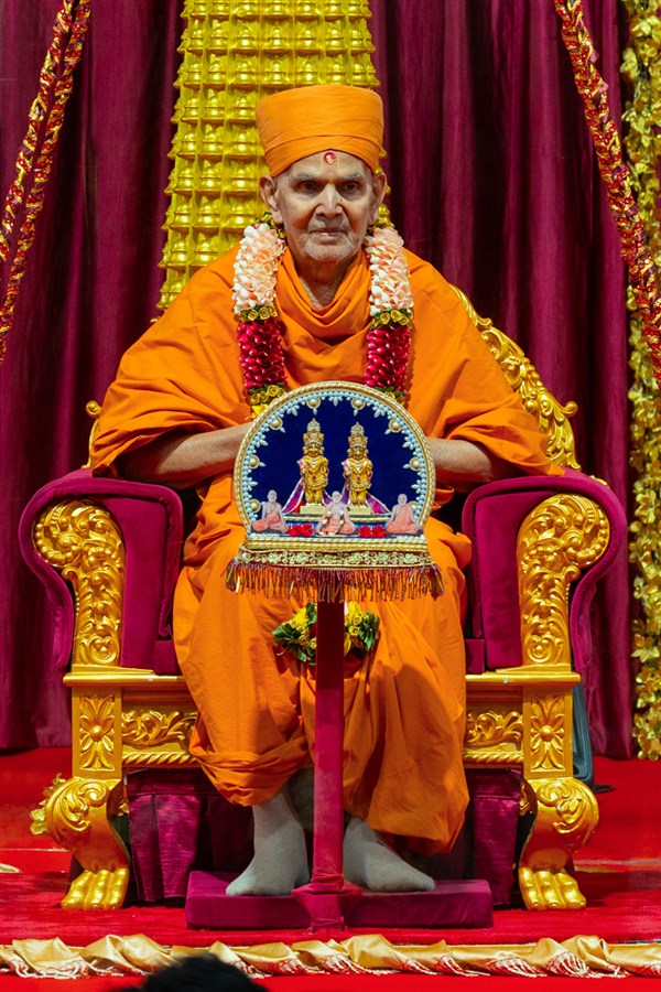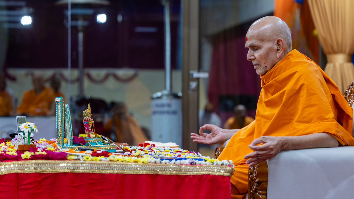 Swamishri engrossed in darshan of Shri Harikrishna Maharaj and Shri Gunatitanand Swami Maharaj