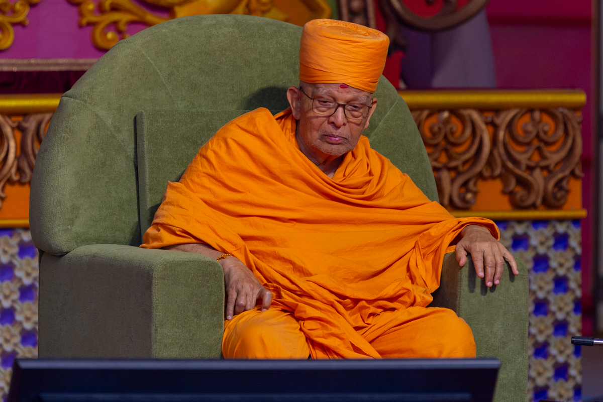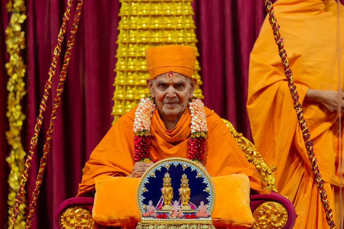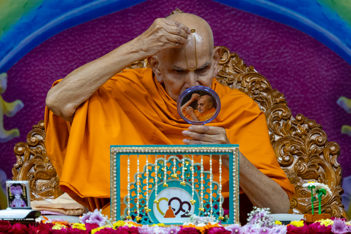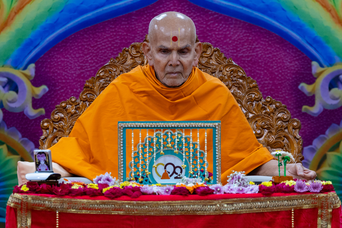 Swamishri engrossed in darshan of Shri Harikrishna Maharaj and Shri Gunatitanand Swami Maharaj