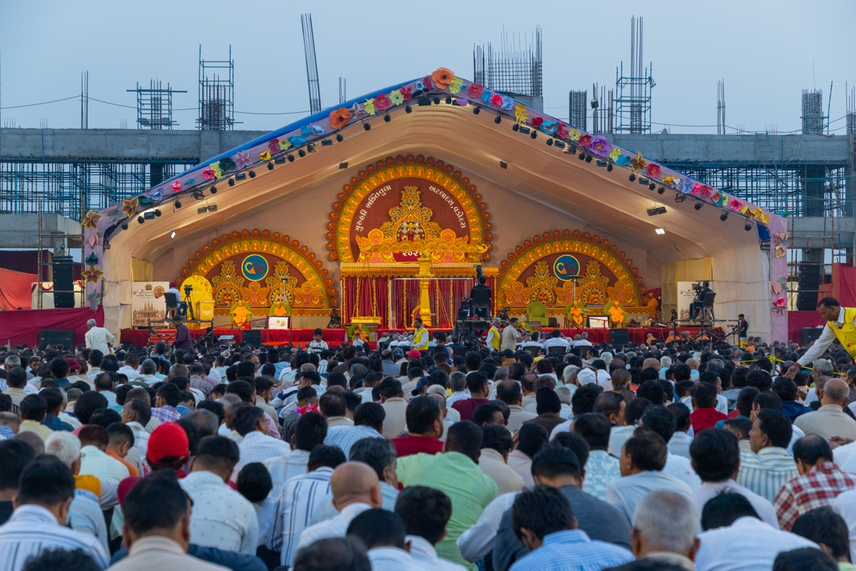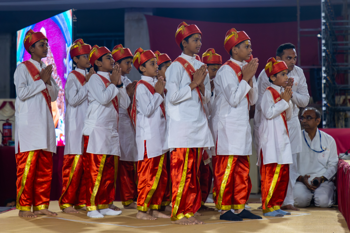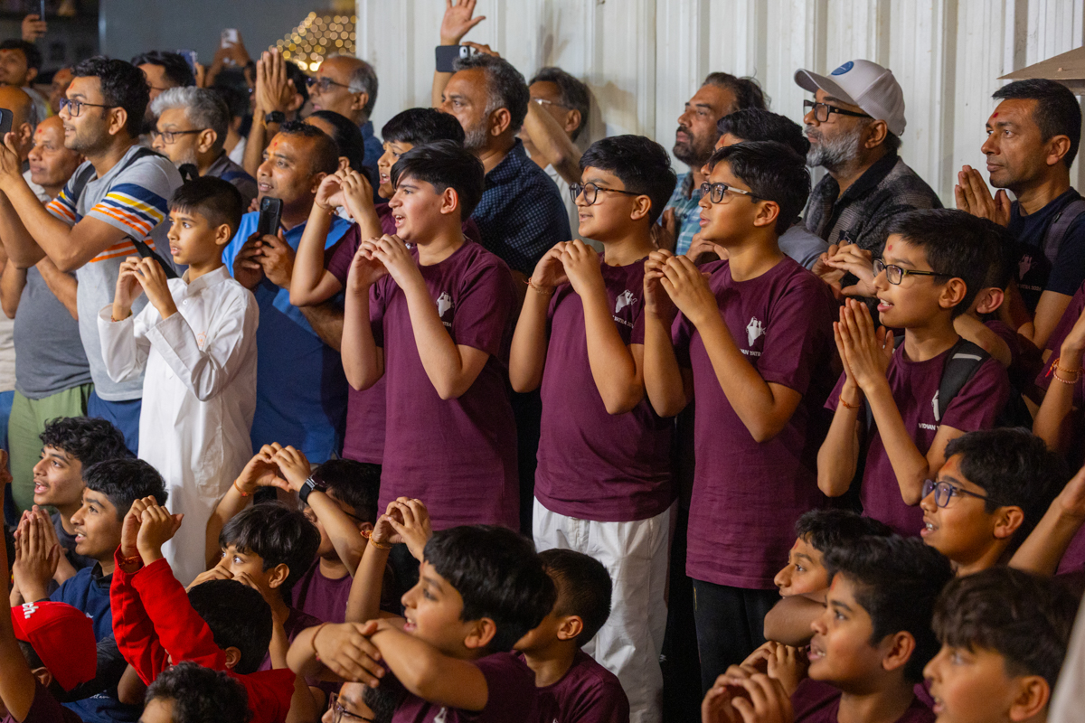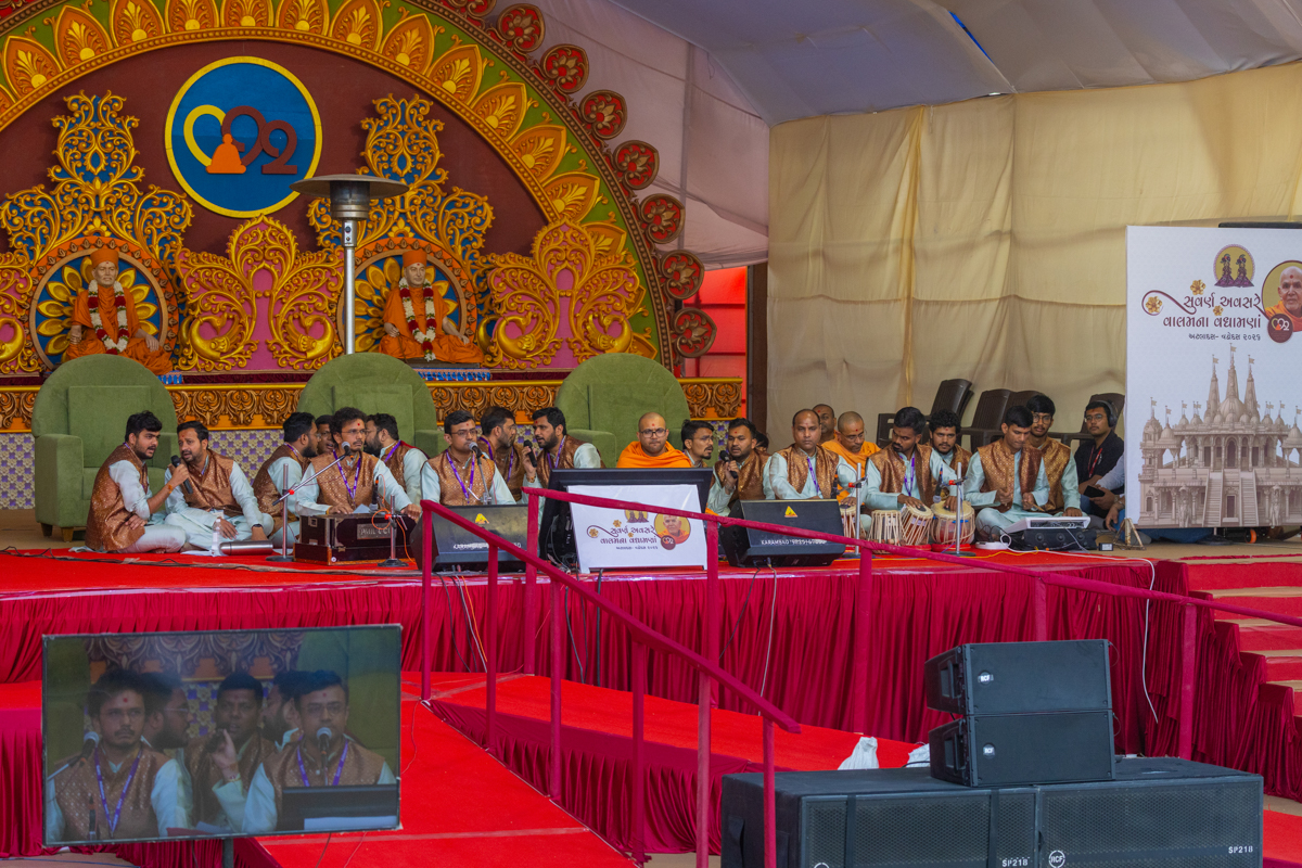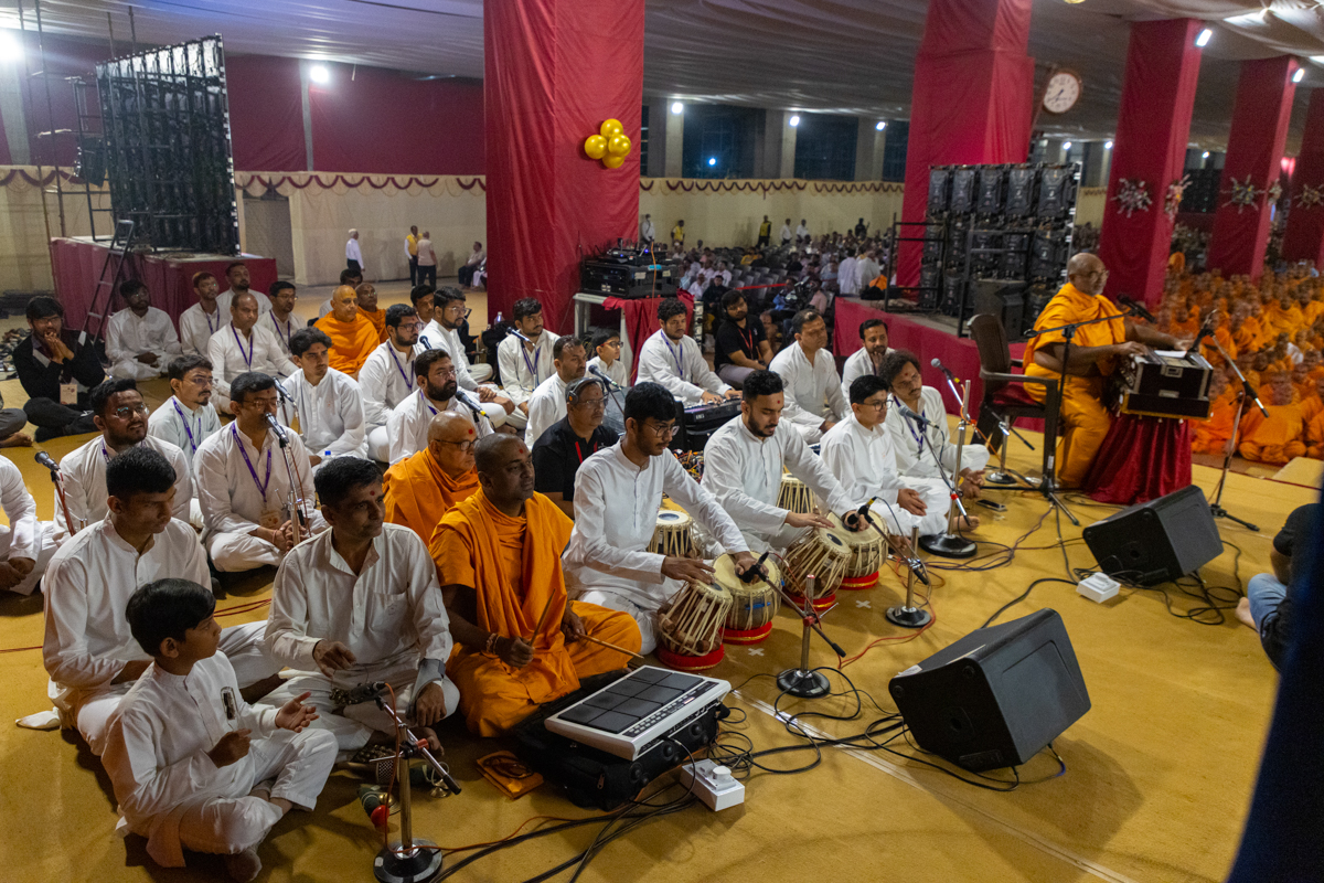 Yuvaks sing kirtans at the beginning of the evening 'Bhakti Tula' assembly