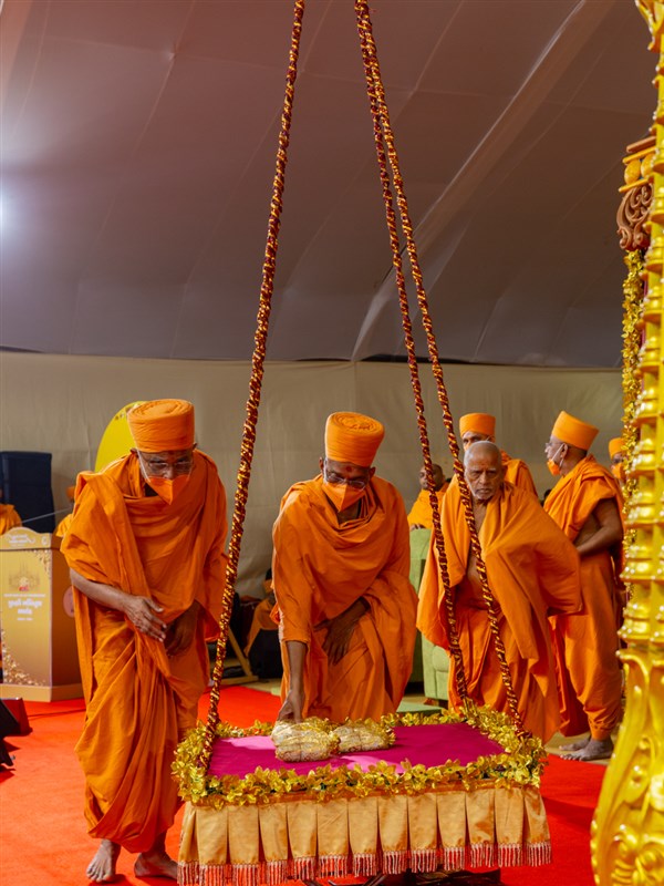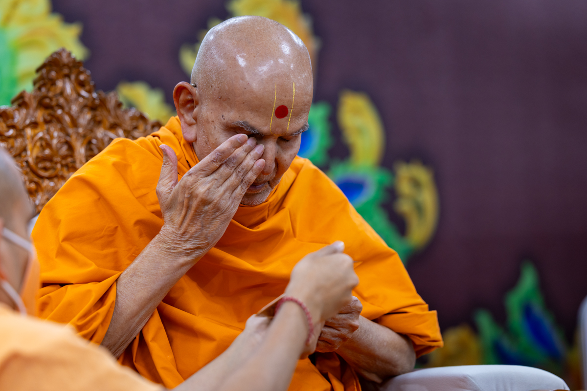 Swamishri touches his eyes after reverently touching the holy charanarvind of Shri Akshar-Purushottam Maharaj