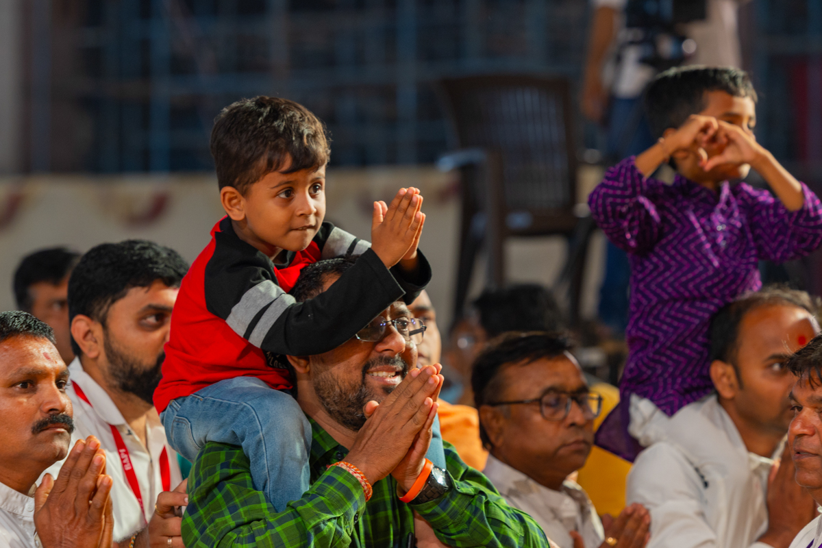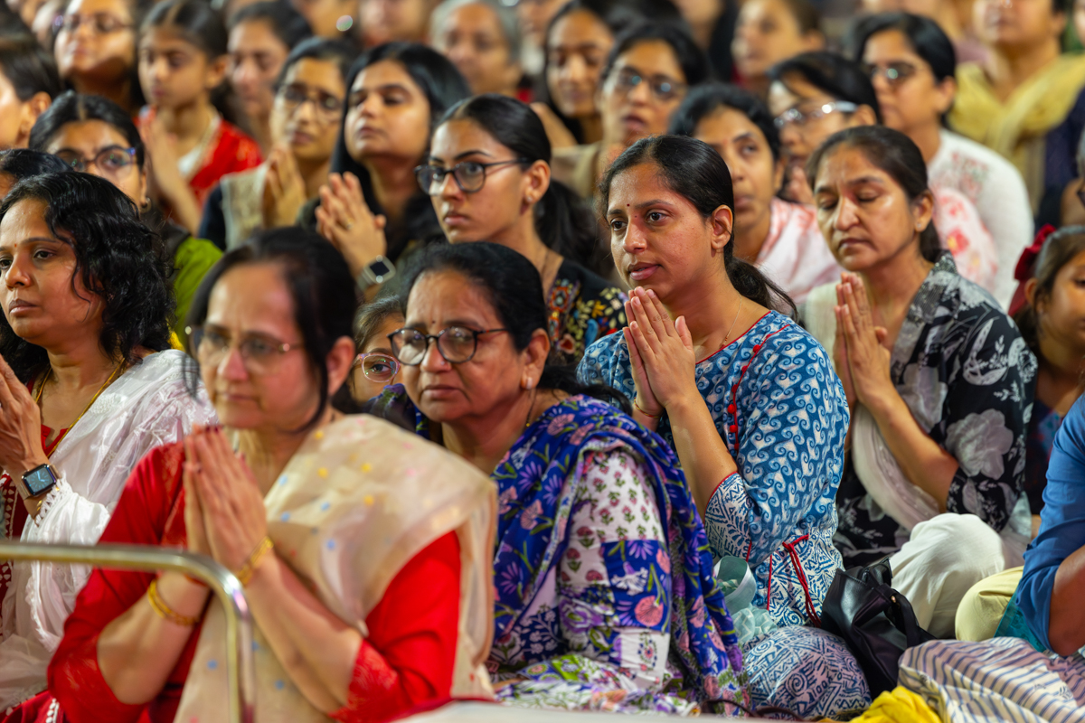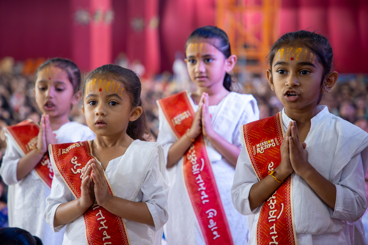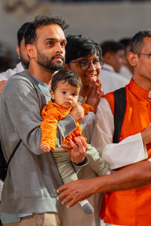 A balak leads everyone in reciting the sadhana mantra and daily prayer in Swamishri's puja