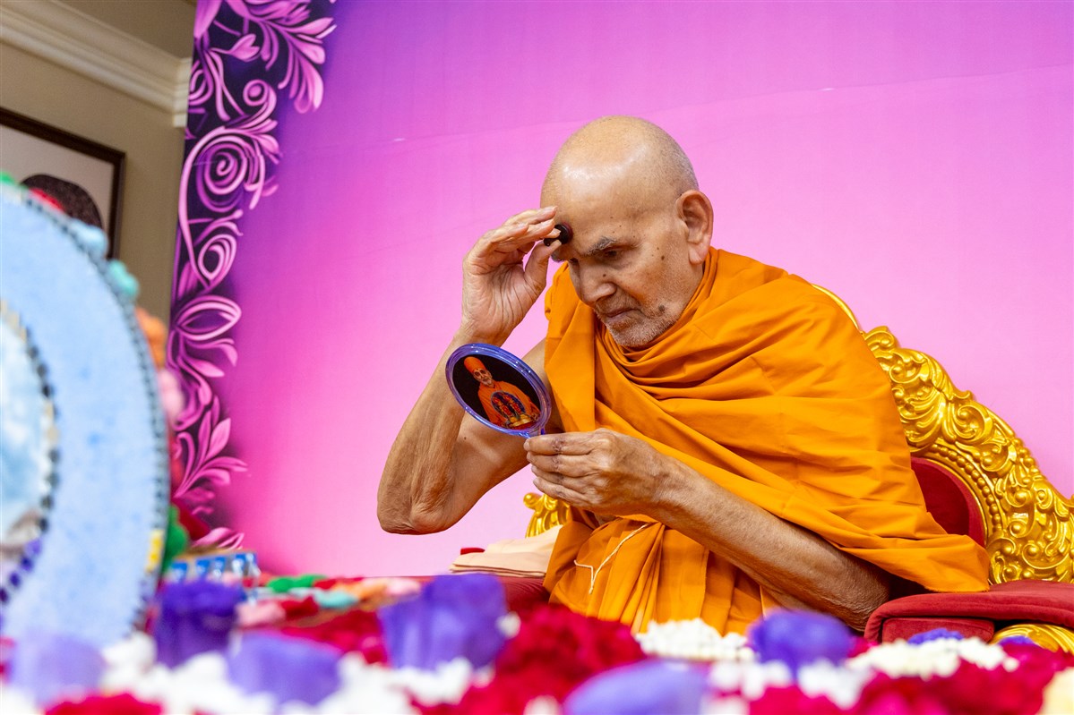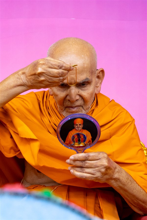 Swamishri applies a tilak on his forehead