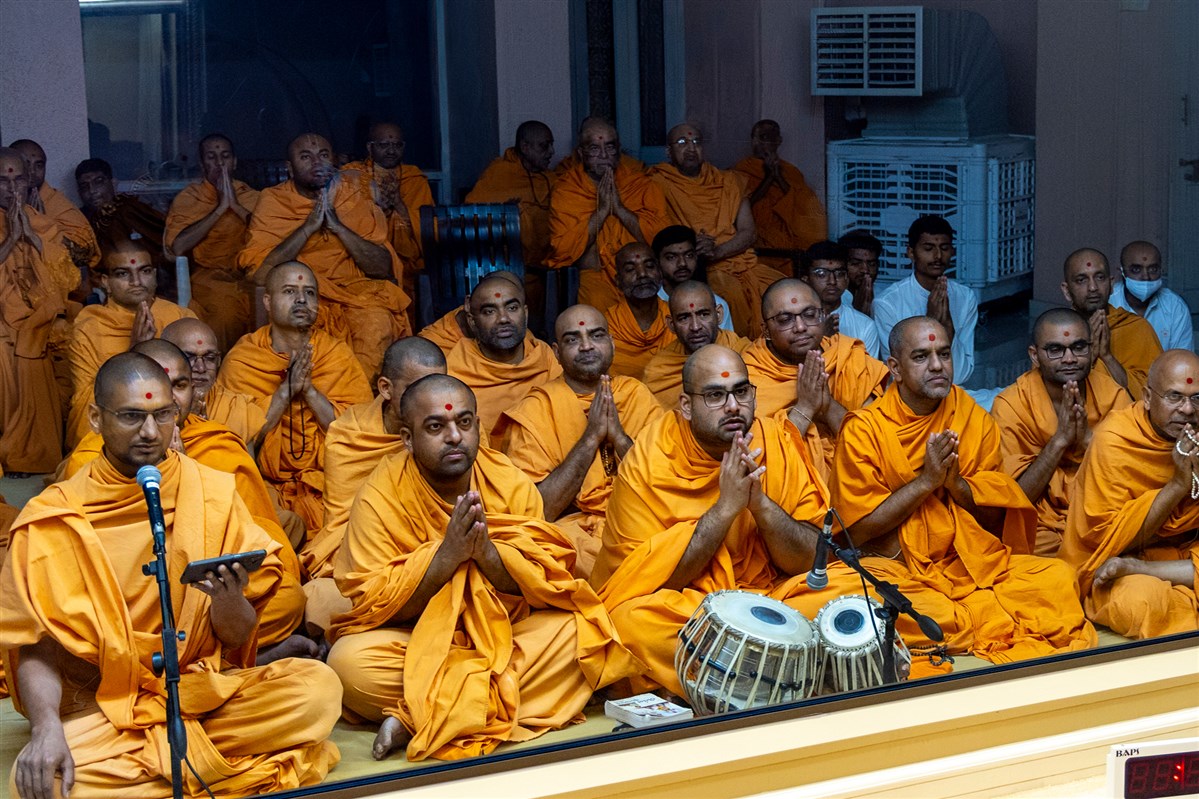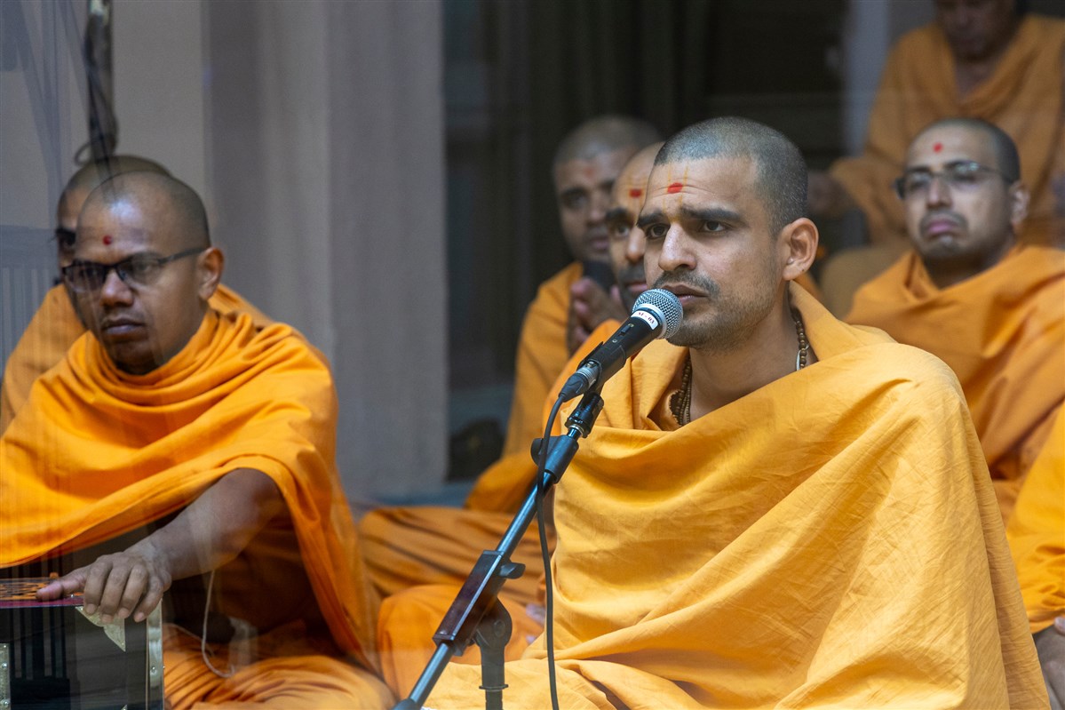 A swami sings a kirtan in Swamishri's daily puja
