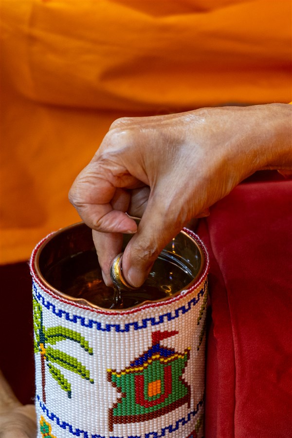 Swamishri sanctifies water with the holy relics of Bhagwan Swaminarayan and the Guru Parampara