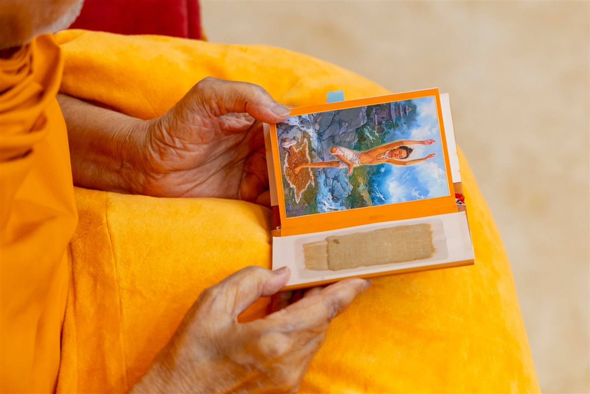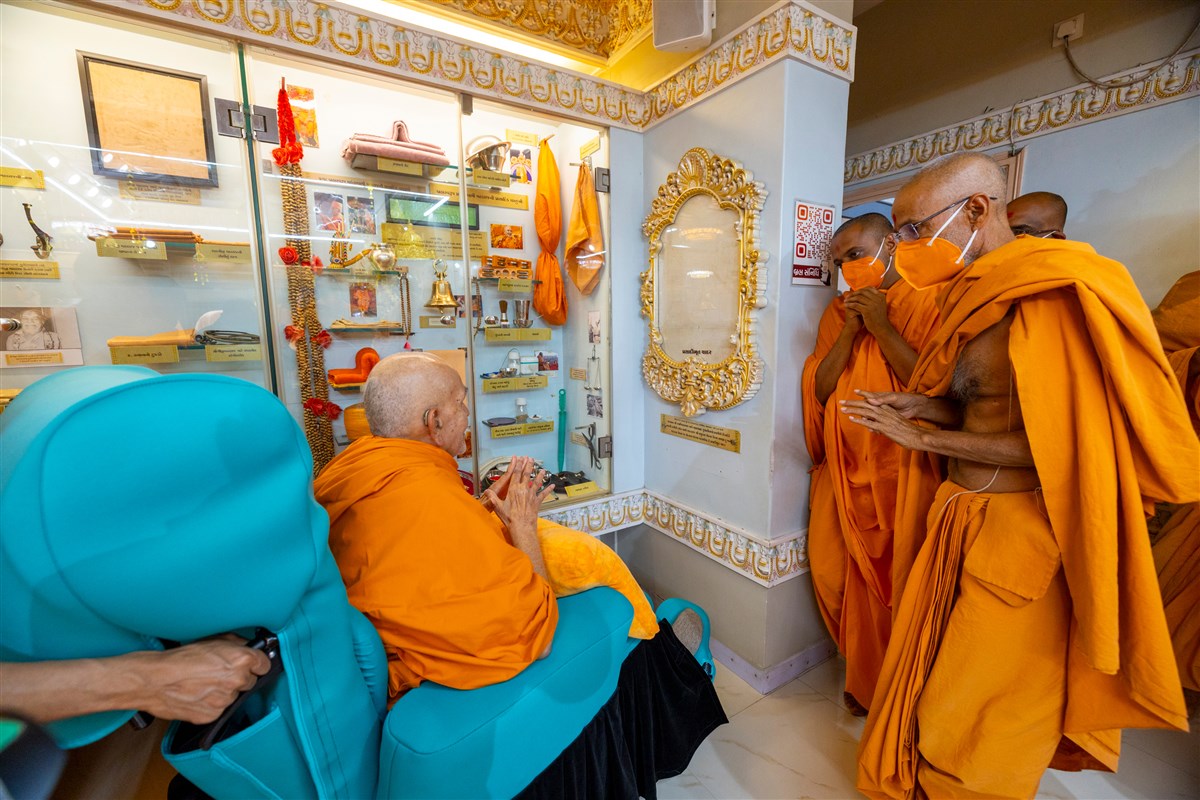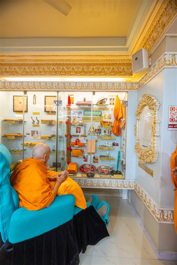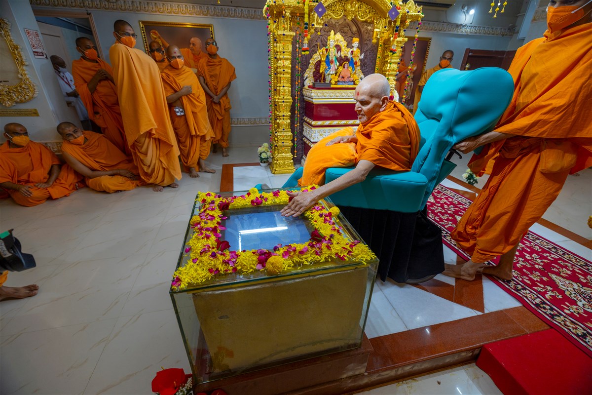 Swamishri engrossed in darshan of the holy relics of Shri Guru Parampara