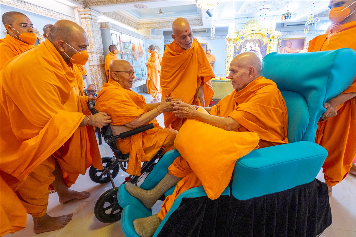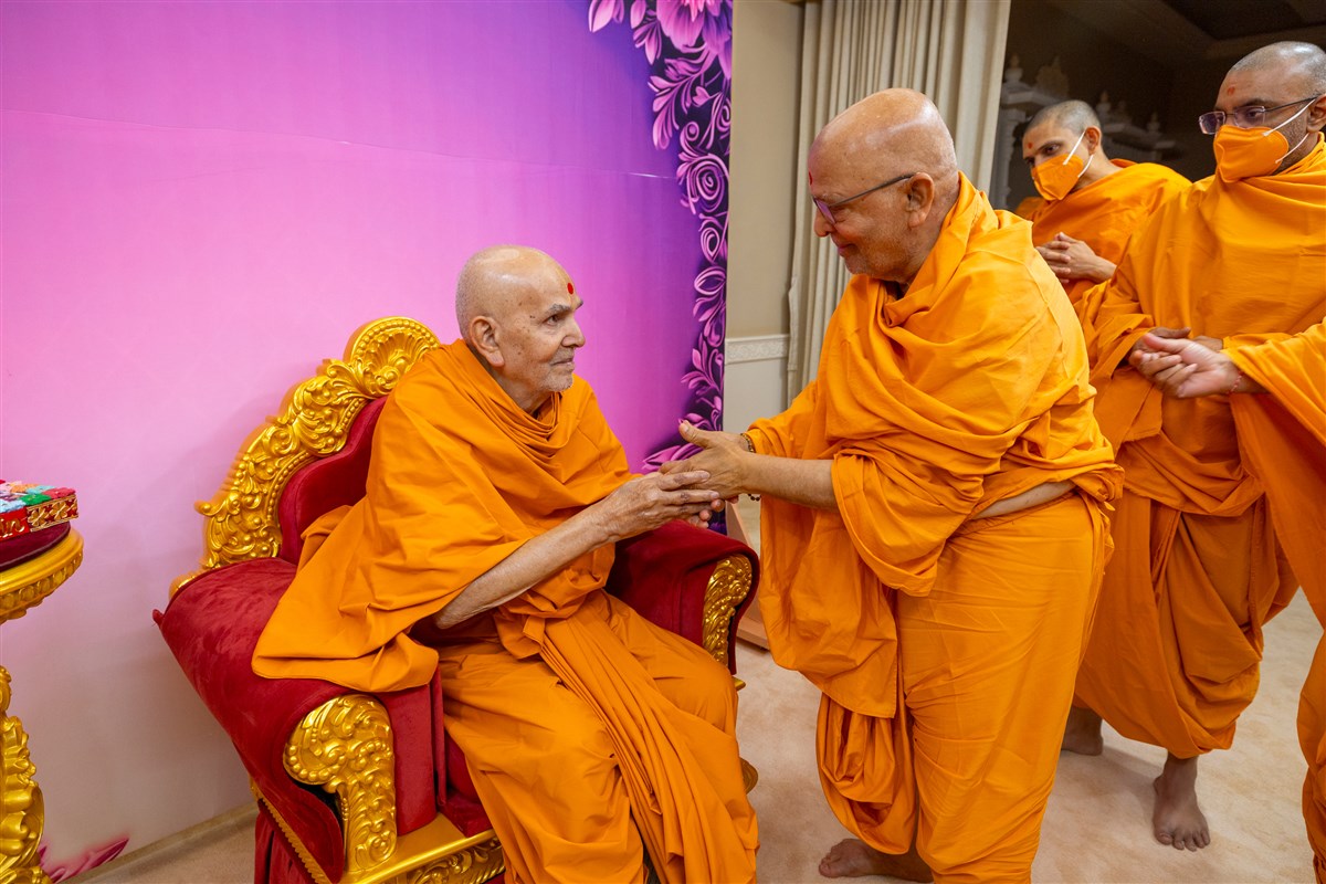 Pujya Ghanshyamcharan Swami greets Swamishri