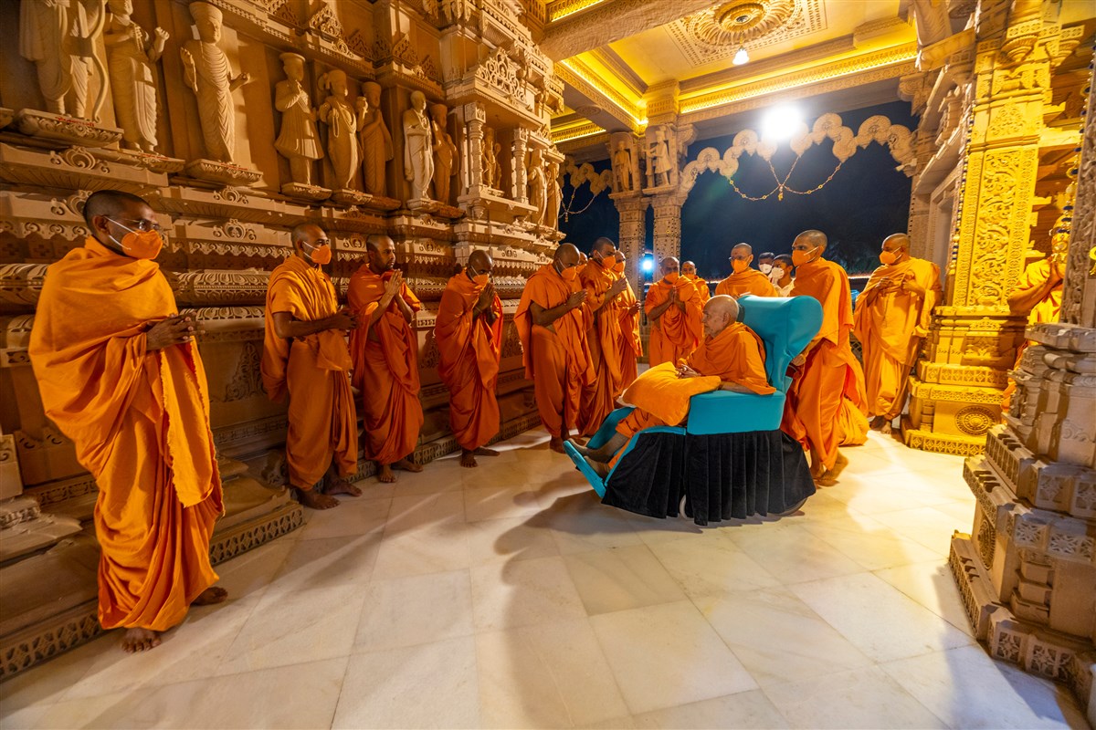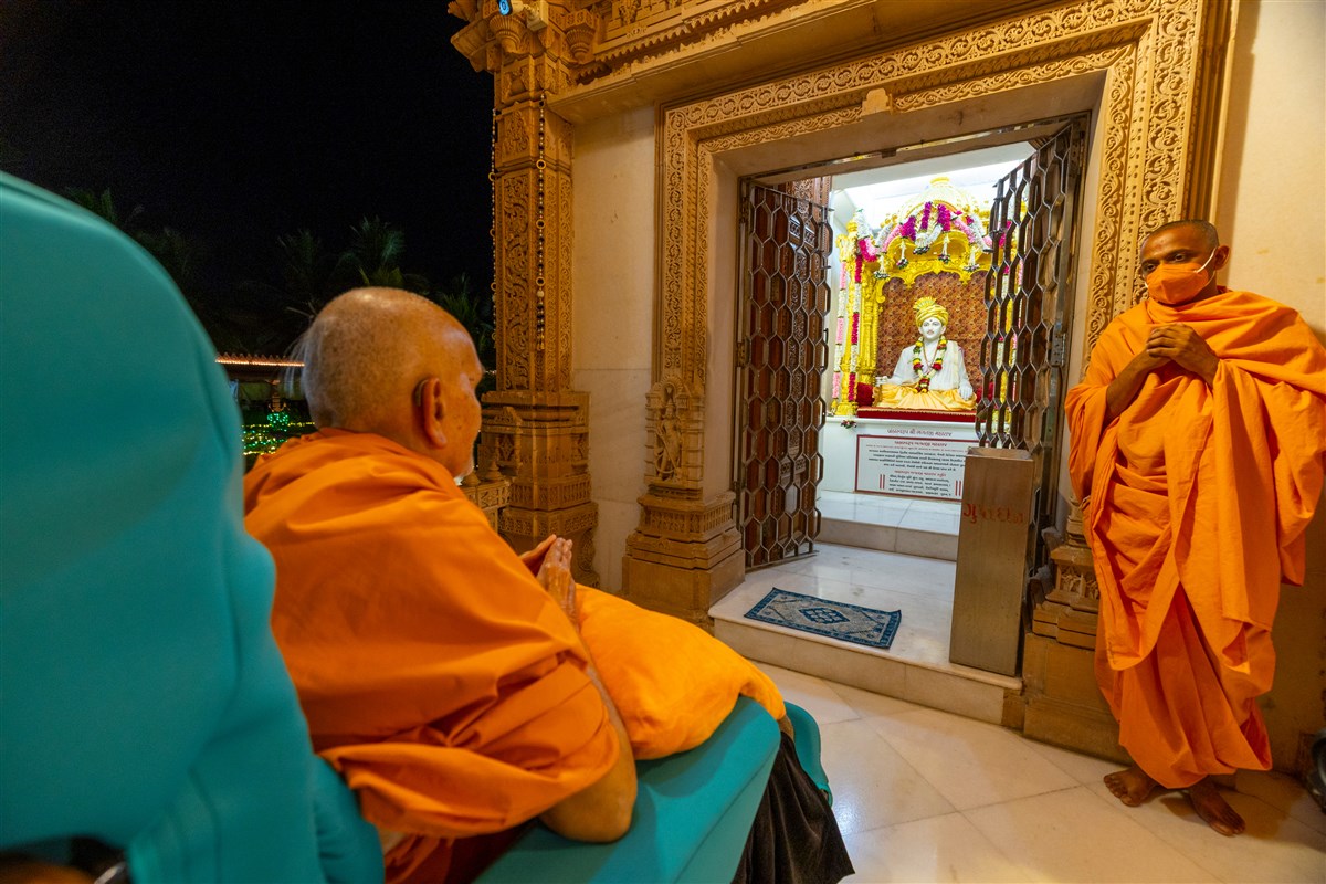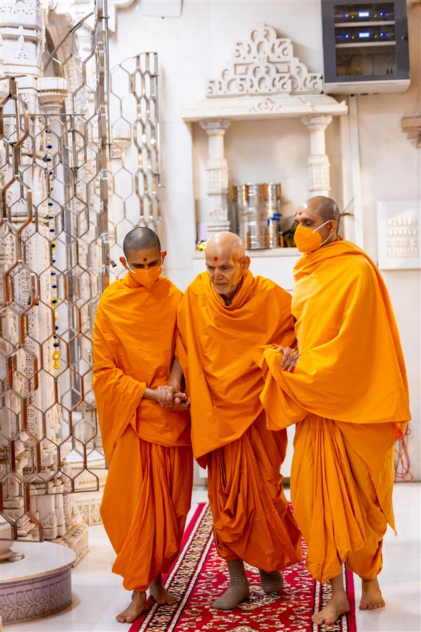 Swamishri arrives for Thakorji's darshan