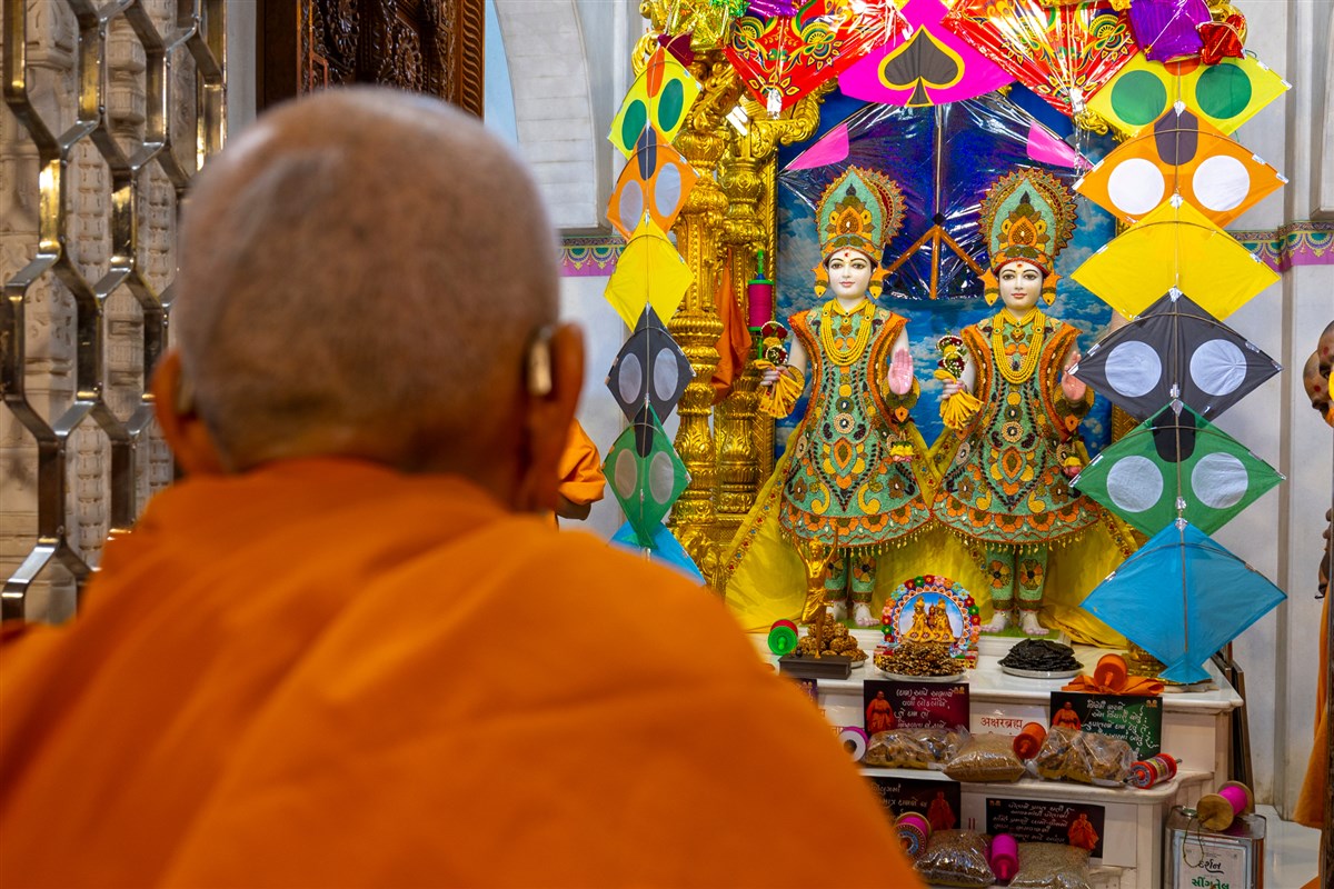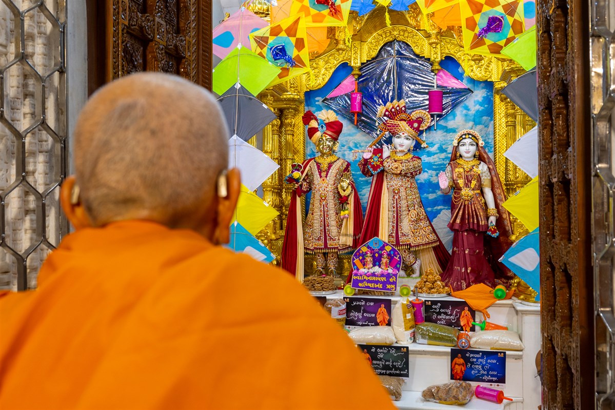 Swamishri engrossed in darshan of Shri Harikrishna Maharaj and Shri Radha-Krishna Bhagwan