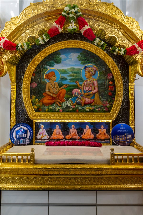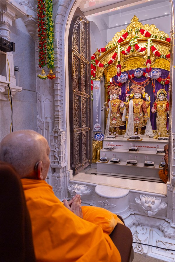 Swamishri engrossed in darshan of Bhagwan Swaminarayan, Aksharbrahma Gunatitanand Swami and Shri Gopalanand Swami